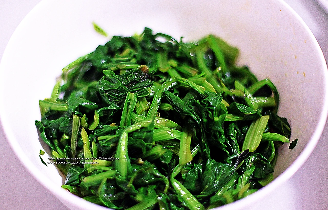 이날 채집한 야생 비에똘라의 맛과 향기도 그러하지 않을까 싶은 생각이 들었다. 샤워 직후 녀석을 데쳐놓고 늦은 점심을 비에똘라 무침으로 먹었다. 놀라운 일이 발어 졌다. 그녀가 올리브유와 조미간장만으로 조몰락조몰락 간단하게 무쳐낸 나물에서 산삼 향가가 풍기기 시작했다. 향기를 인터넷으로 전송할 수만 있다면 얼마나 좋을까..ㅜ 그 대신 초간단 리체타로 버무려 식재료 본연의 맛을 느끼게 요리한 비에똘라 무침을 보여드린다. 이탈리아서 처음 발견한 야생 봄나물의 비주얼이다. 성분과 효능을 살펴보고 글을 맺는다.