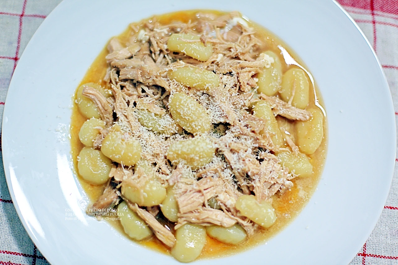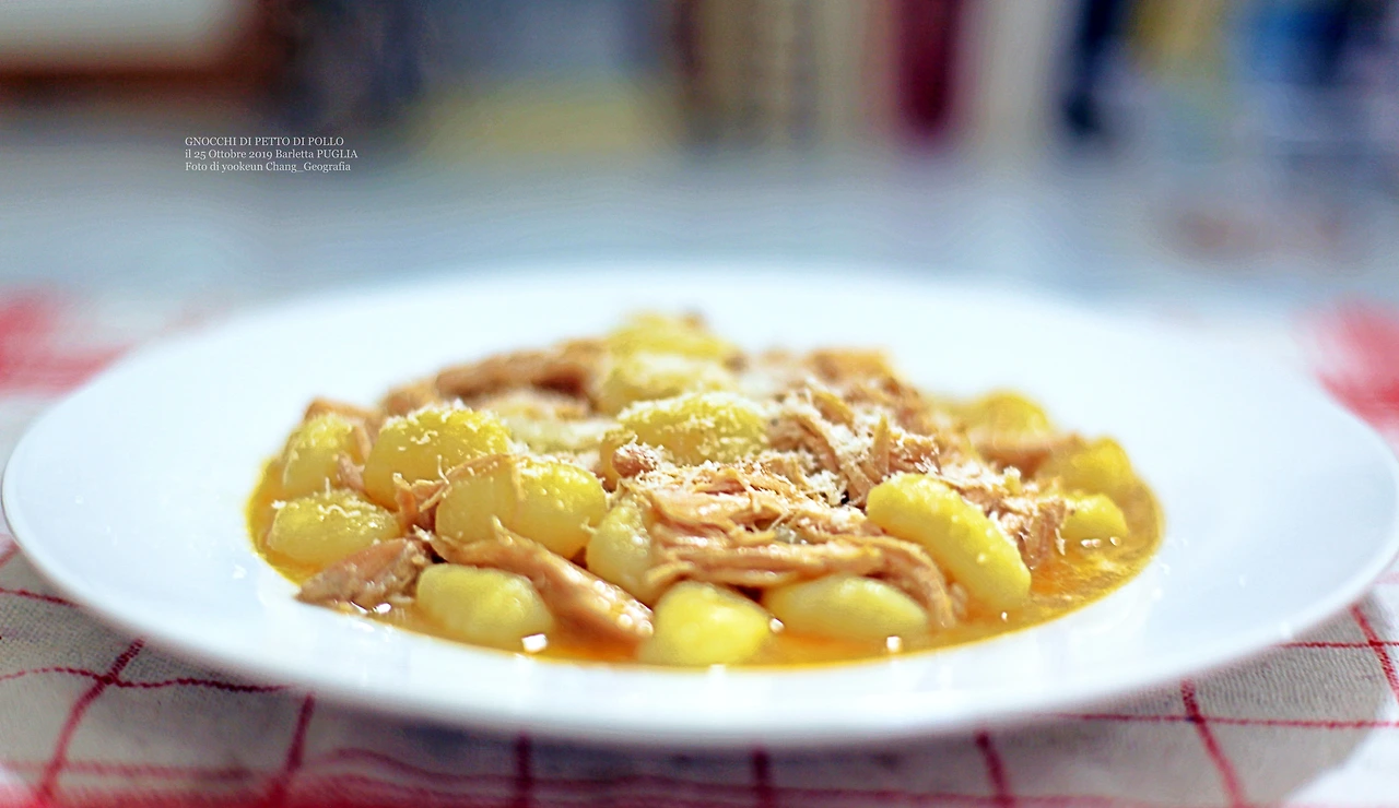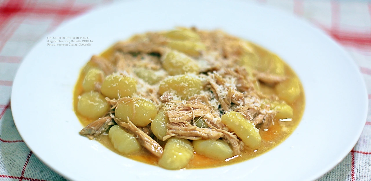 먼저 밋밋하고 퍽퍽하여 식감이 떨어지는 닭가슴살을 닭다리와 함께 압력 밥솥에 끓여낸다.(관련 포스트 참조) 이때 만들어진 육수 반 컵 분량을 움푹 파인 프라이팬에 두르고 닭가슴살을 찥어 넣는다. 그리고 필요한 분량의 뇨끼를 넣는다. 이날 사용한 뇨끼는 대략 80그램 정도의 양이다. 그리고 빠르마지아노 레지아노 포르맛지오를 넉넉하게 갈아 넣는다. 그런 다음 프라이팬의 뚜껑을 덮고 센 불로 끊는 즉시 가장 낮은 약불로 줄여준 후 대략 5분 정도 천천히 익힌다.