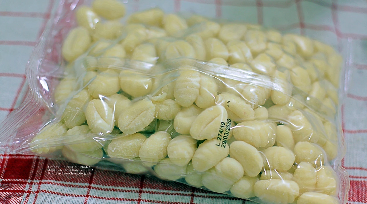 먼저 자료사진 몇 장을 눈여겨 봐 주시기 바란다. 사진 속에는 봉지에 든 뇨끼가 눈에 띌 것. 상표를 엎어놓고 내용물만 촬영했는데 한 봉지 무게는 1kg이다. 그렇다면 생면 파스타 뇨끼의 가격은 얼마나 할까. 놀라지 마시라. 사흘 전 대형 매장에 들러 1유로(대략 1300원)에 구입했다. 이탈리아가 요리 천국으로 소문이 나는 건 간단하다.