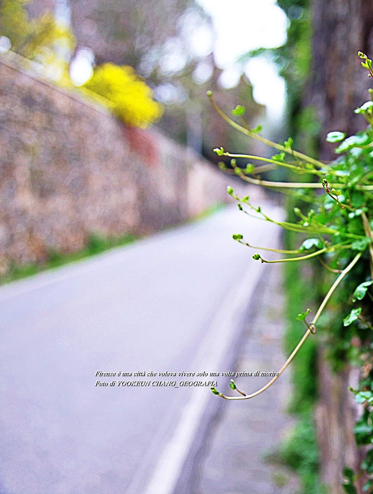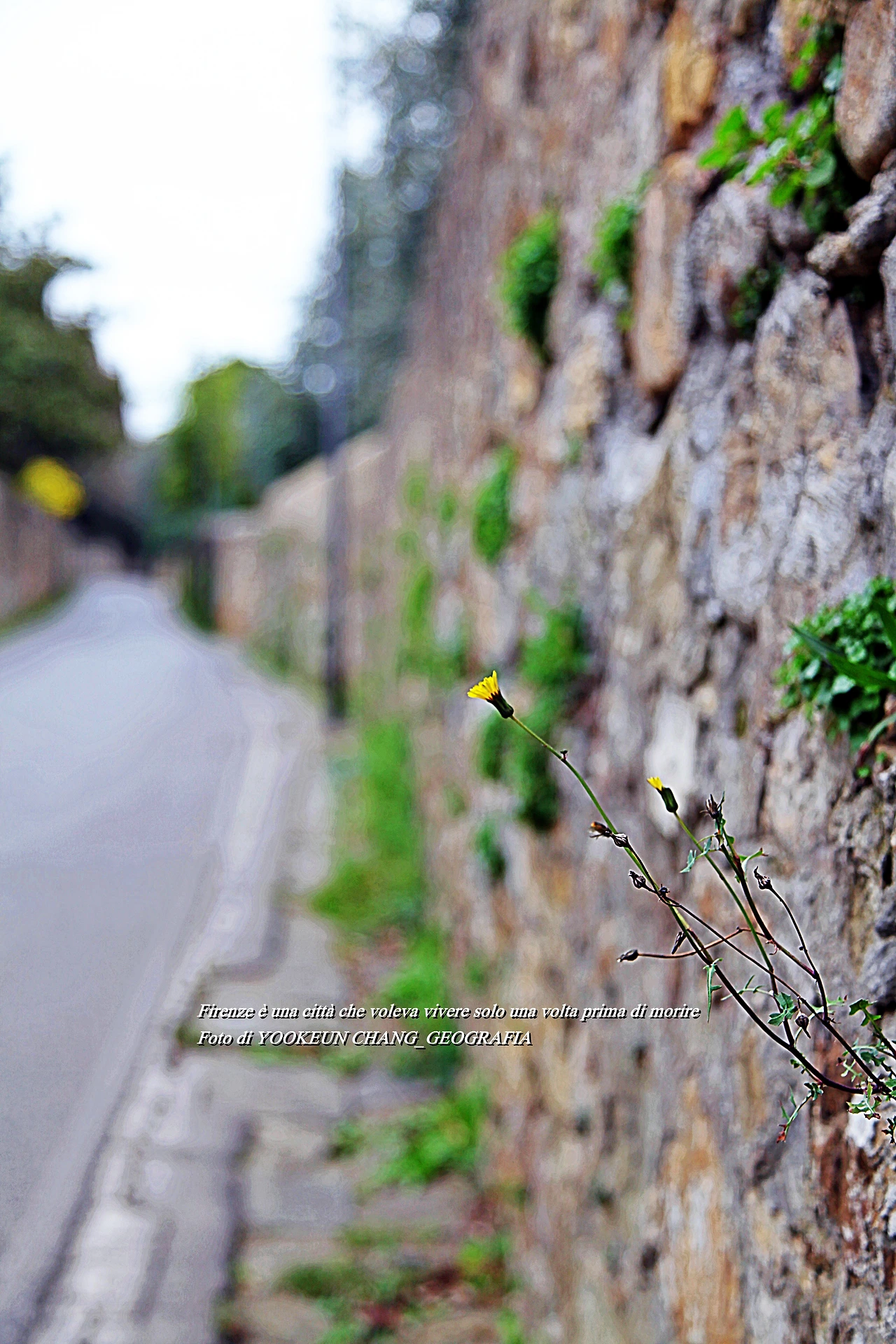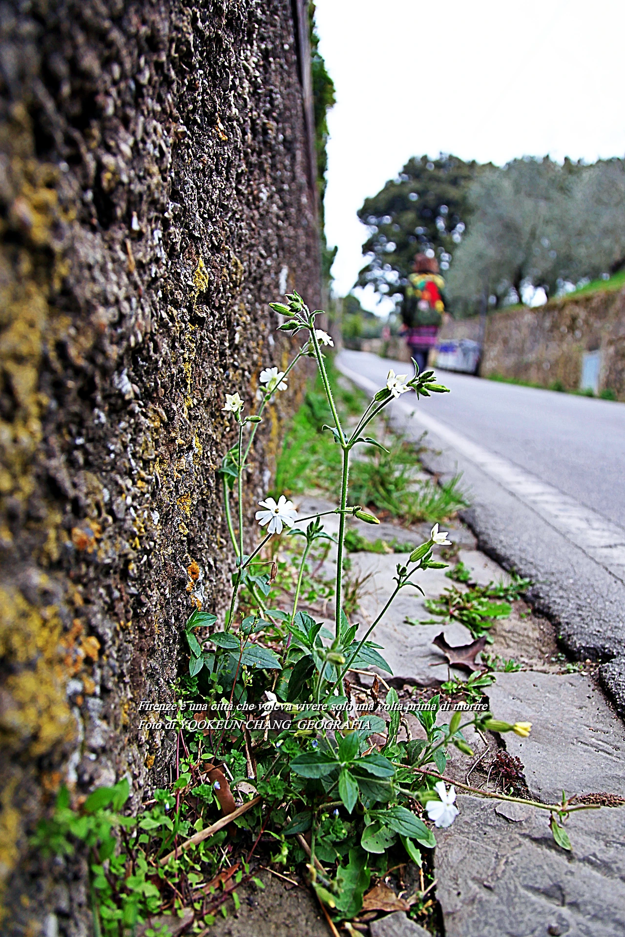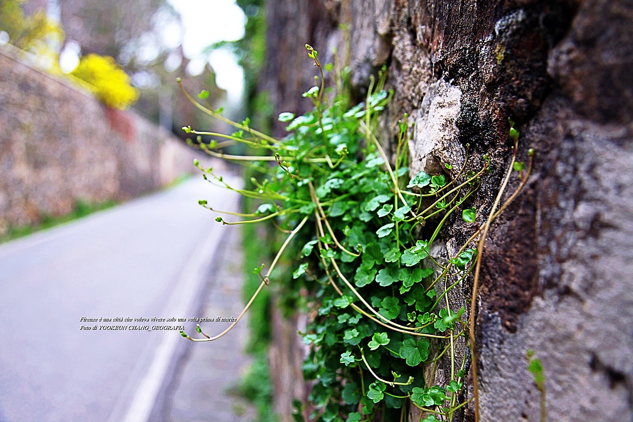 퓌렌쩨 시내를 벗어나 퓌에솔레로 가는 길에 들어서면 높은 담벼락을 만나게 된다. 담벼락은 높고 대문은 굳게 잠겨있는 고급빌라촌에 발을 들여놓으면 우리나라에서 보지 못한 매우 특별한 풍경들이 눈길을 끈다. 풀꽃들이 담벼락 아래 혹은 길 가장자리에 피어있는 것이다. 퓌렌쩨 시내 중심에서는 쉽게 관찰할 수 없는 신의 그림자인 아름다움이 이때부터 하나둘씩 발현되기 시작한다고나 할까..