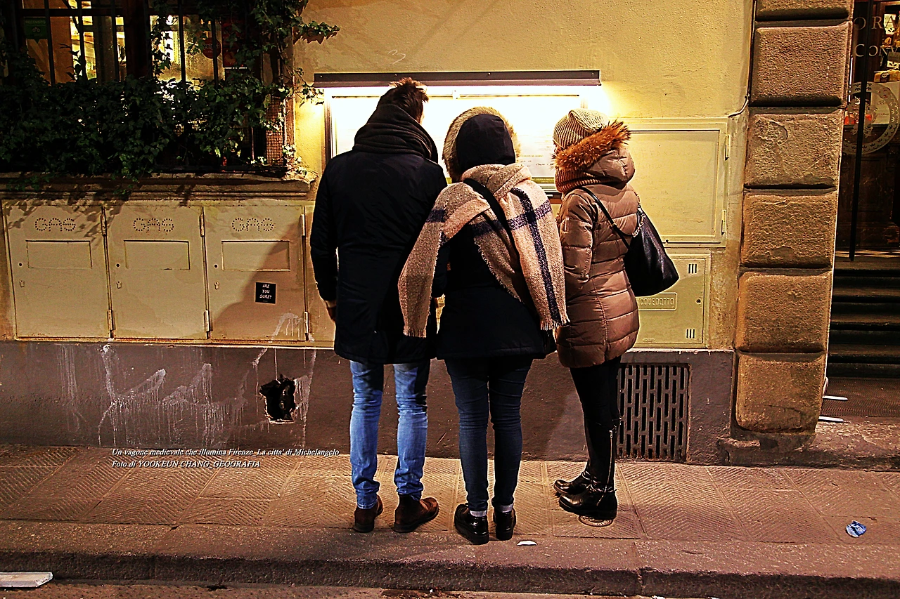두 여자 사람과 한 남자 사람이 무엇인가 들여다보고 있다. 옷 차림새를 미루어 겨울이다. 그렇다면 이곳은 어디인가.. 이곳은 미켈란젤로의 도시 피렌체(피렌체라 쓰고 '퓌렌쩨'로 읽는다)에 위치한 한 리스또란떼이다. 좀 더 정확히 말하면 퓌렌쩨 두오모(Cattedrale di Santa Maria del Fiore)를 중심으로 아르노 강변(Fiume arno) 서쪽에 있는 꽤 유명한 리스또란떼의 바깥 풍경이다. 길을 지나던 사람들이 만찬을 즐기기 위해 차림표를 들여다보고 있는 것이다.