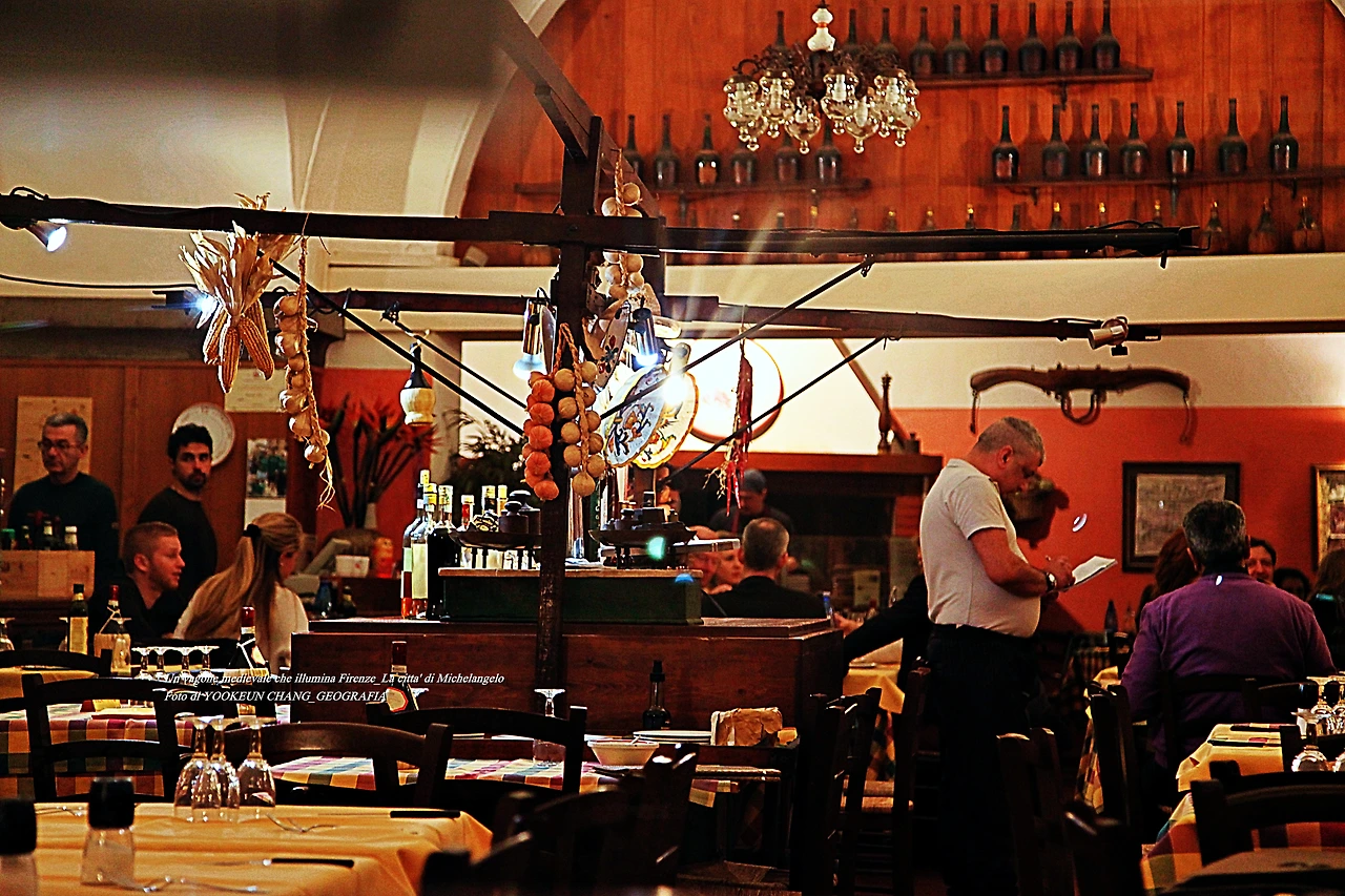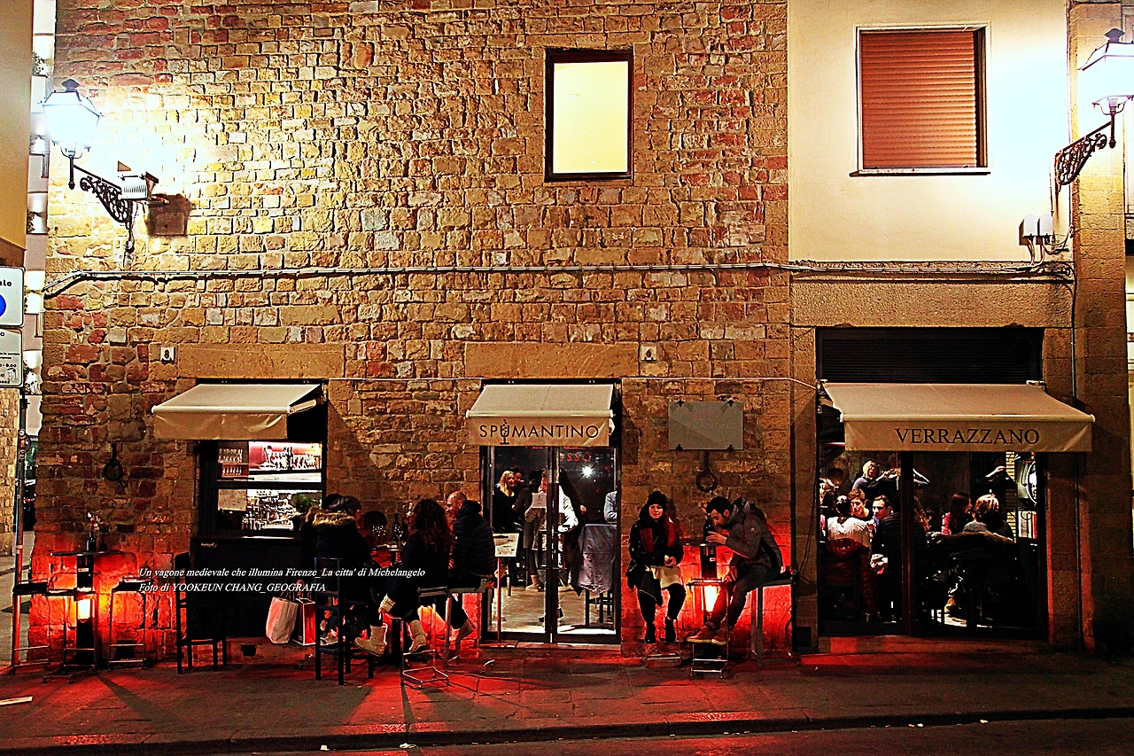 퓌렌쩨의 명소 시뇨리아 광장(Piazza della Signoria) 앞 골목의 밤 풍경, 사람들은 이곳에서 하루를 마감한다. 도시 곳곳에 산재한 카페와 리스또란떼..