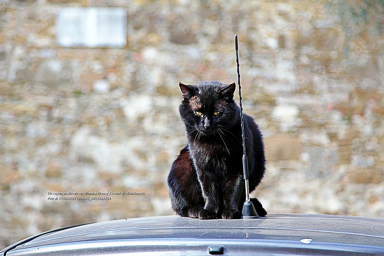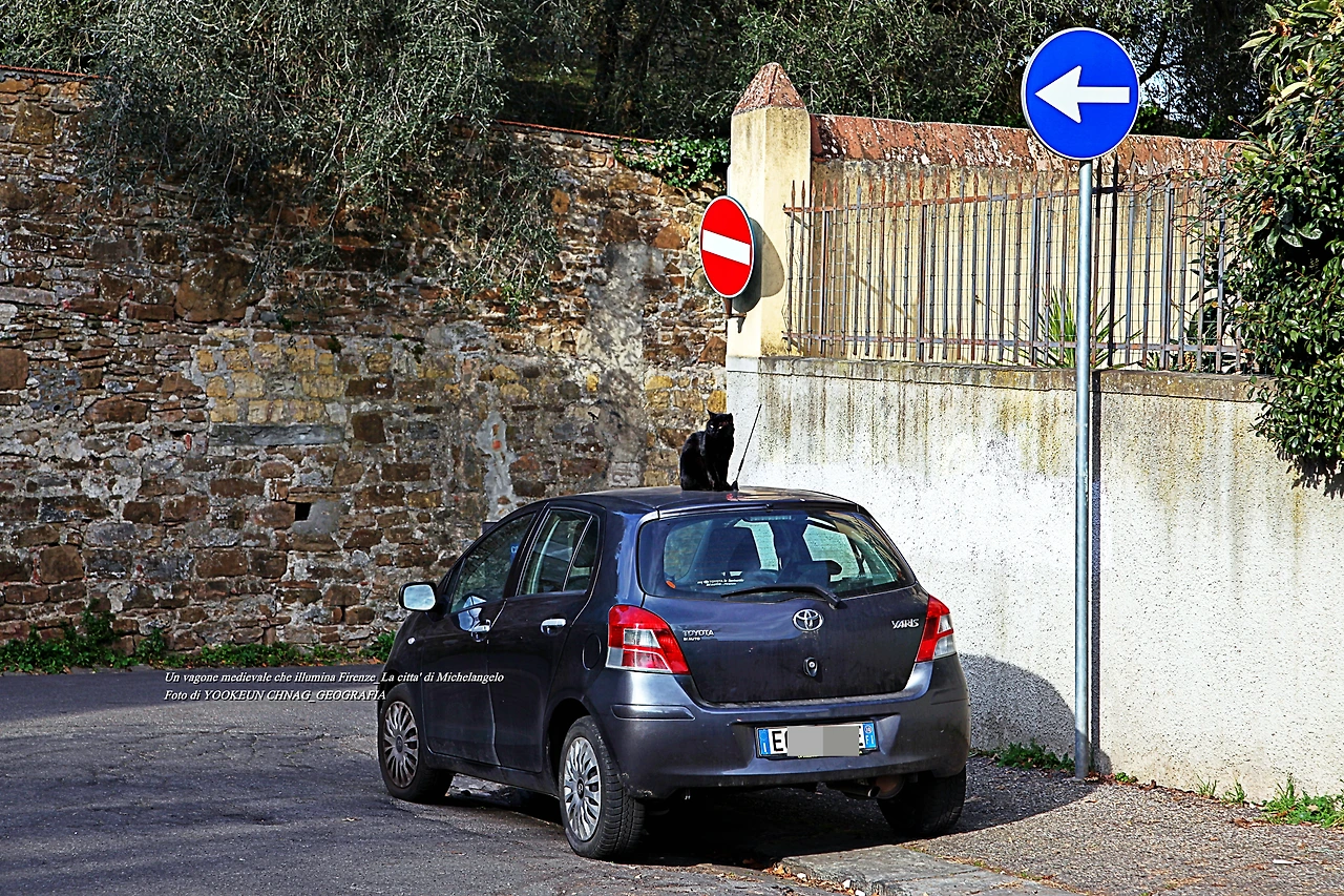 어느 날, 죽기 전에 딱 한 번만 살아보고 싶었던 미켈란젤로의 도시 퓌렌쩨의 한 리스또란떼서 일할 때의 일이다. 숙소가 위치한 뽀르따 로마나(Porta Romana)에서 멀지않은 벨로스구아르도(Bellosguardo)로 출사를 나갈 때 골목 어귀에서 길냥이를 만나게 됐다. 녀석은 자동차 천장에 앉아 이방인의 출현을 눈여겨보고 있었다. 녀석의 앞에는 자동차의 안테나가 서 있었다. 그럴 리가 없지만 녀석은 전파를 수신하고 있는 자세이자 낯선 이방인의 동향을 유심히 살피고 있는 풍경이다.