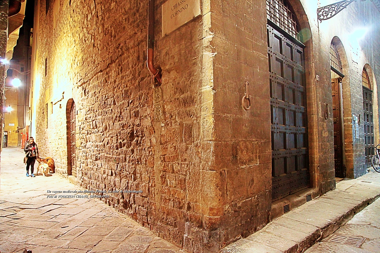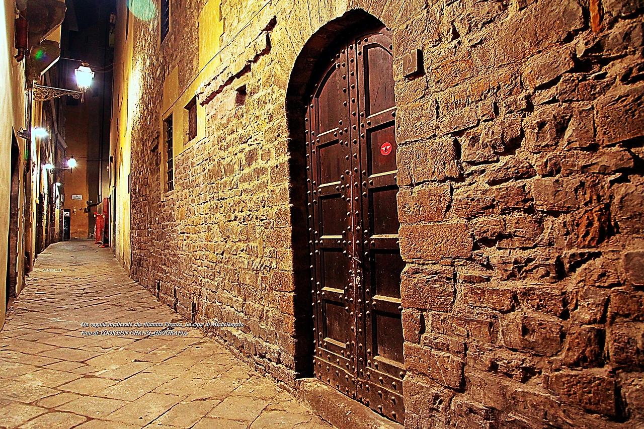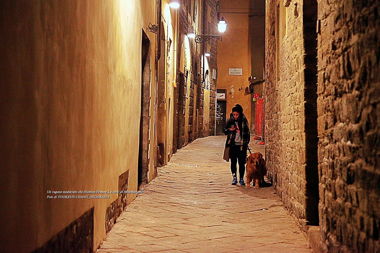 첫눈에 봐도 인적이 드문 이곳은 우리가 죽기 전에 딱 한 번만 살아보고 싶었던 미켈란젤로의 도시 퓌렌쩨의 밤 풍경이다. 자정이 넘은 야심한 시각에 시내를 둘러보면서 만난 풍경으로 중세로 시간여행을 떠난 듯한 묘한 기분이 드는 곳이다. 이날 골목길에서 반려견을 데리고 니온 한 여성을 만나게 됐다. 그녀는 반려견 두 마리를 데리고 나왔는데 얼핏 보아 녀석들의 응가를 위한 산책으로 보였다.