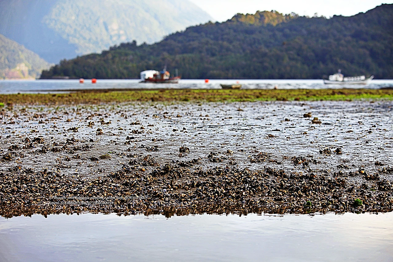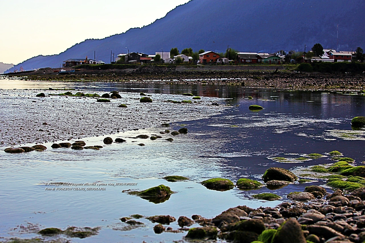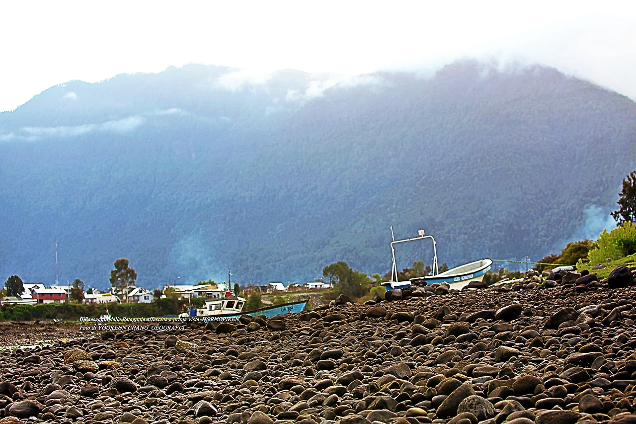 남반구의 우기가 끝나갈 무렵.. 갯가길 뒤로 오르노삐렌 마을과 화산(Hornopirén (volcano))이 촉촉이 안개비에 젖어있다. 바람은 잠든 지 오래다.