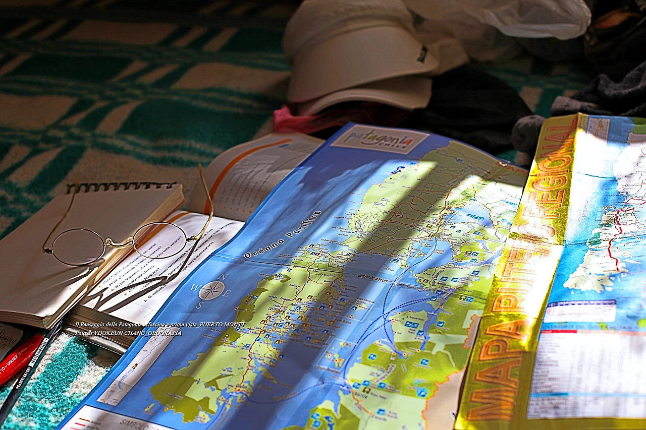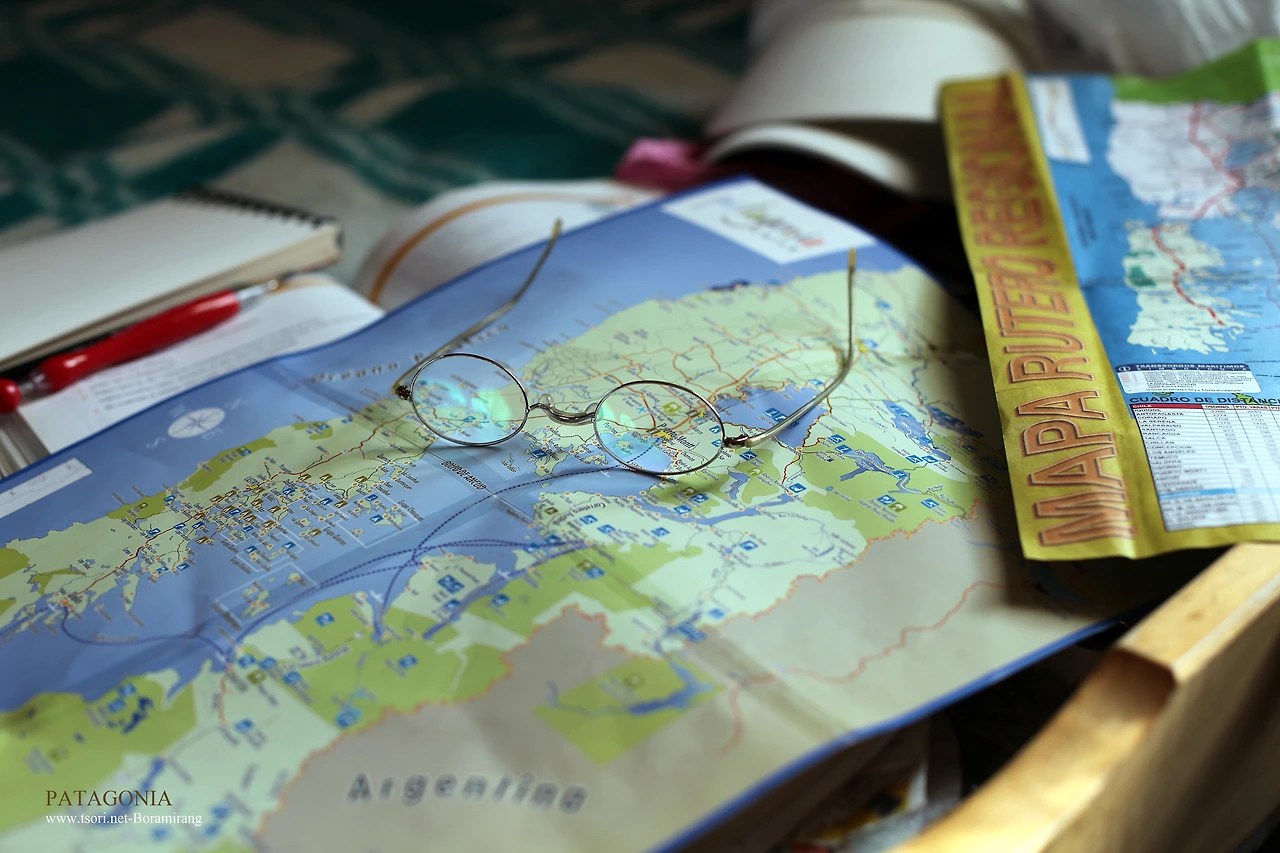 숙소의 침대 위에 자도를 펴 놓고 장차 우리가 만나게 될 파타고니아 여정을 살피고 있다. 요즘은 상상도 하지 못할 여행정보를 직접 챙기고 다녔다. 배낭 속에는 지도 외에도 여행정보가 든 론니플래닛(Lonely Planet)과 두꺼운 수첩과 스케치북 등이 들어있었다.