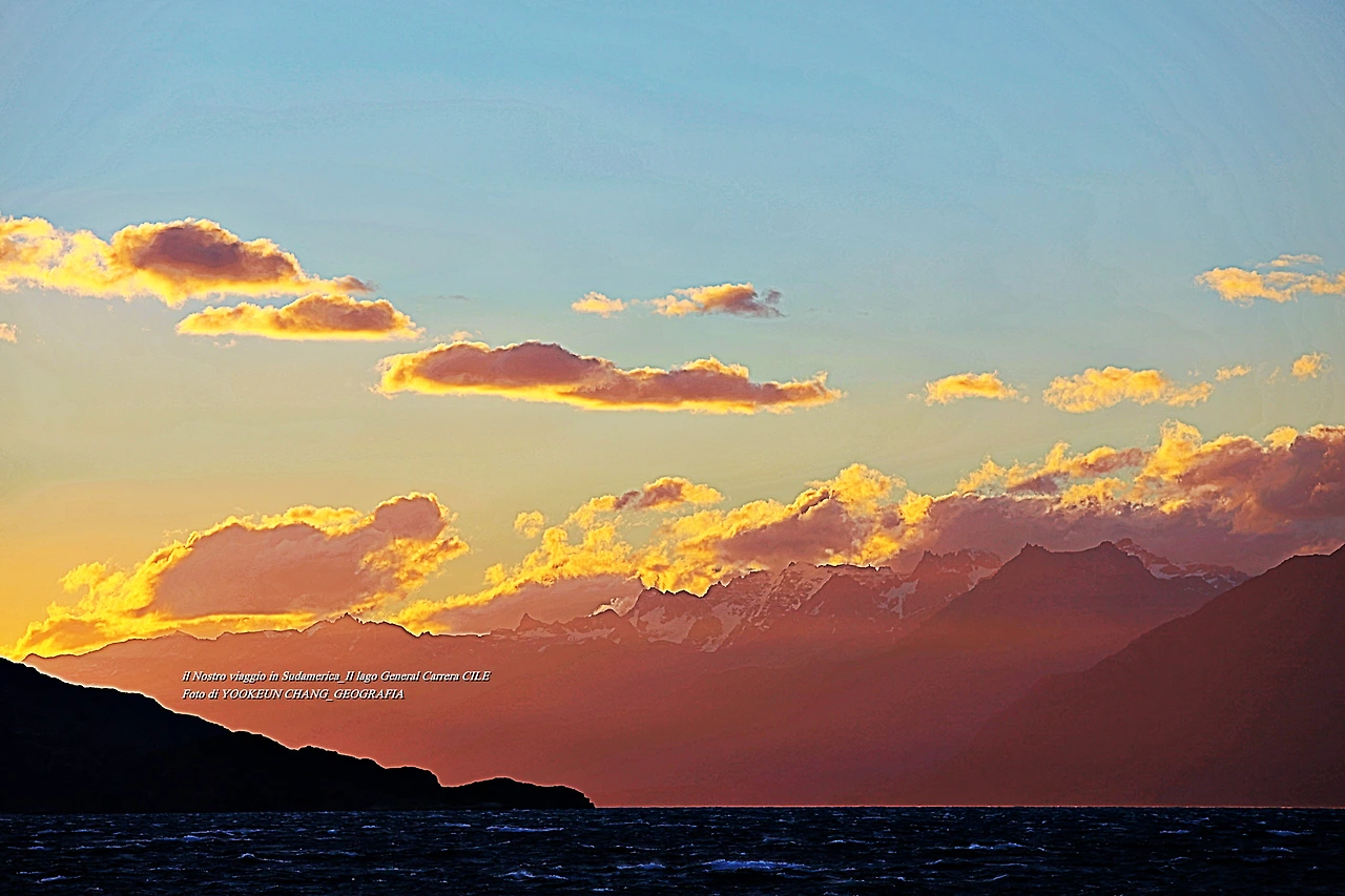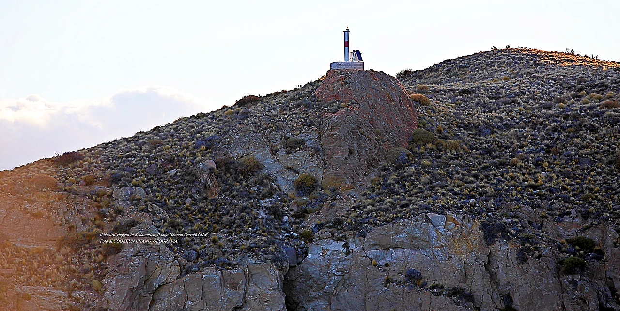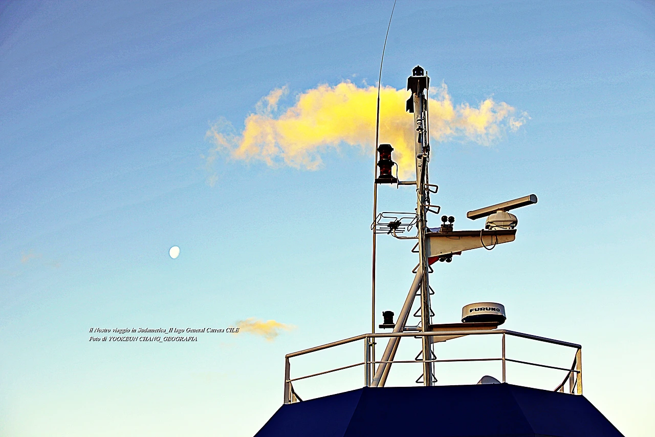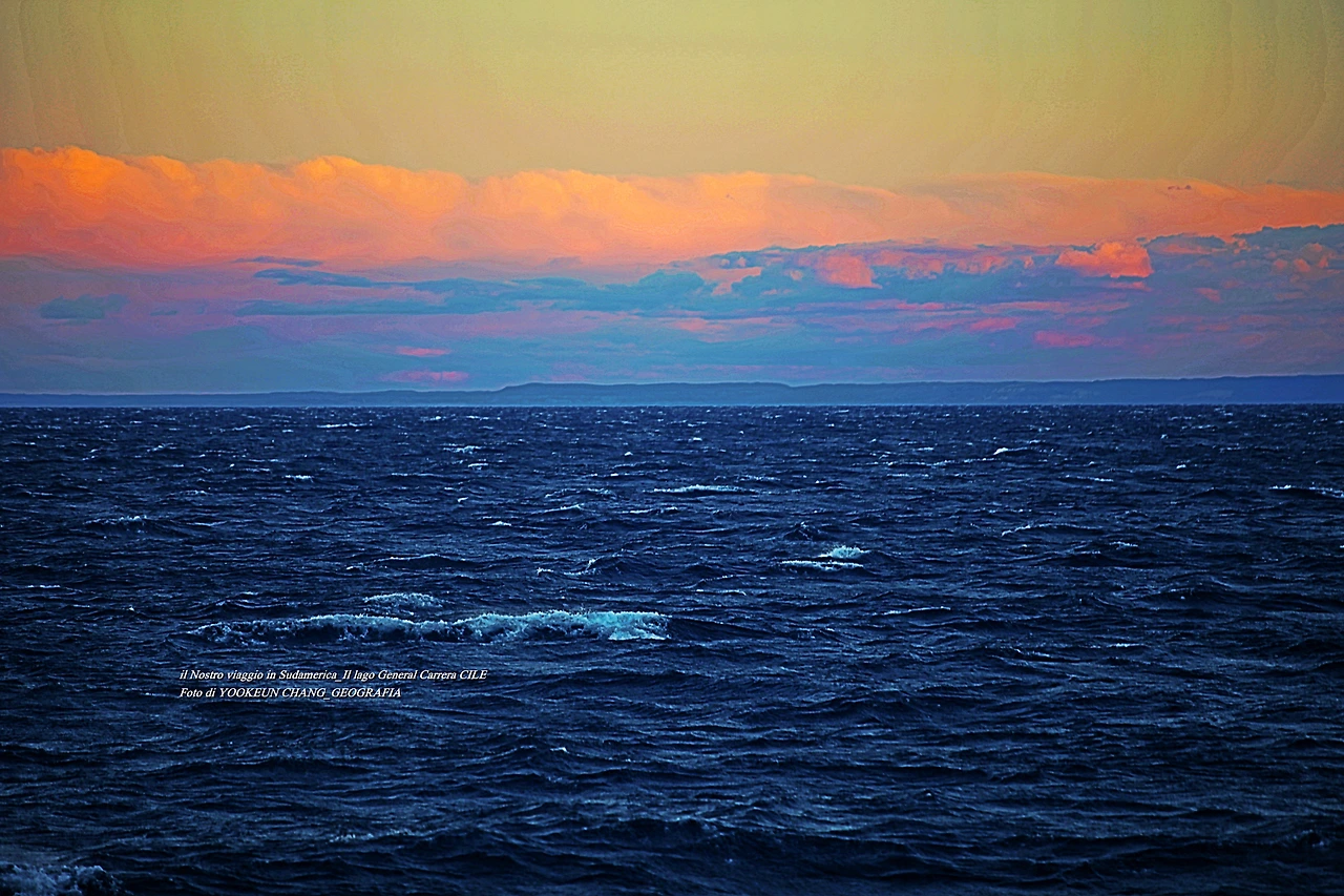 우리를 태운 훼리호는 어느덧 호수 가운데를 지나 칠레 치코 가까운 곳의 작은 섬 곁을 통과하고 있었다. 섬 위에는 등대를 닮은 등주가 우리를 빤히 내려다보고 있었다. 서쪽 하늘에는 해넘이가 시작되고 있었다. 해넘이에 비친 호수가 큰 바다를 닮았다.