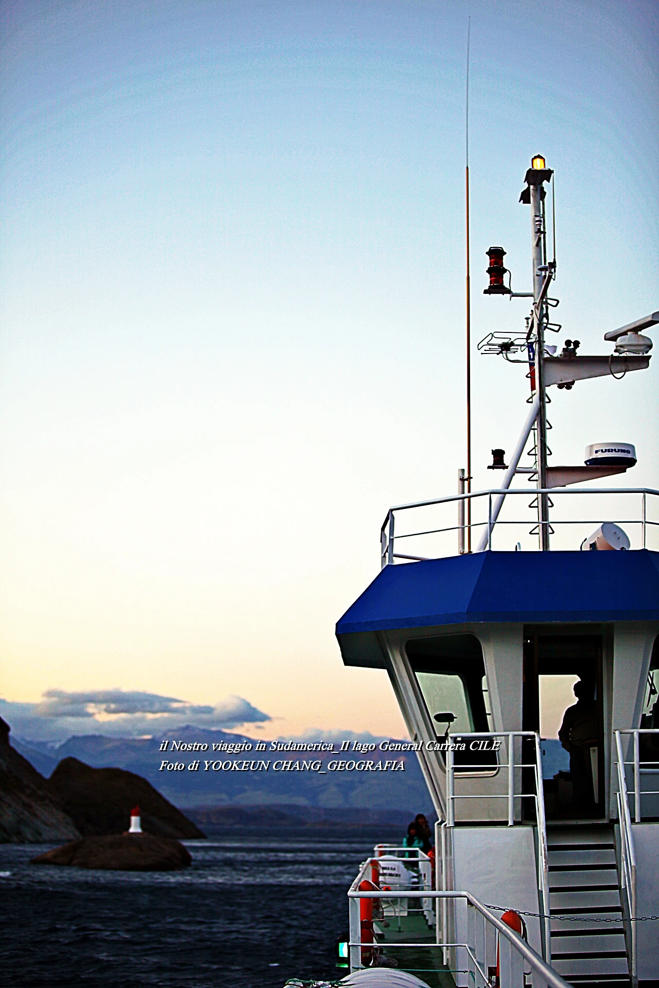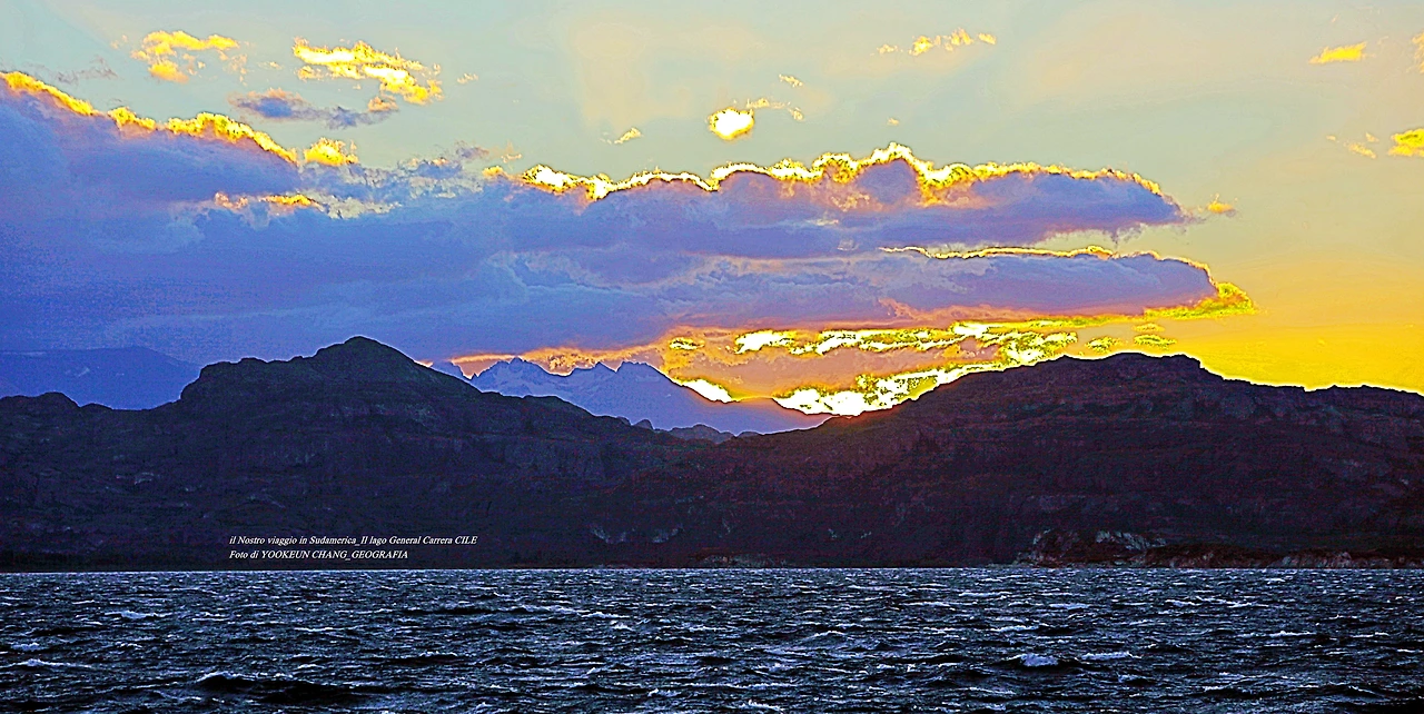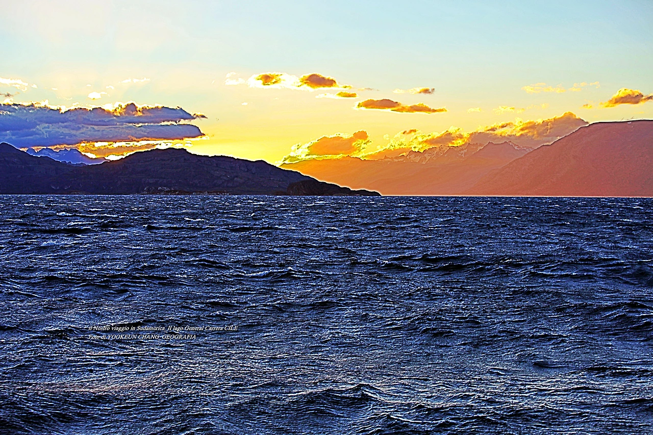 우리를 태운 훼리호는 어느덧 호수 가운데를 지나 칠레 치코 가까운 곳의 작은 섬 곁을 통과하고 있었다. 섬 위에는 등대를 닮은 등주가 우리를 빤히 내려다보고 있었다. 서쪽 하늘에는 해넘이가 시작되고 있었다. 해넘이에 비친 호수가 큰 바다를 닮았다.
