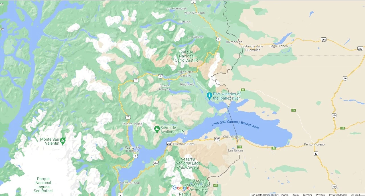 생각건대 우리나라에서 이런 낯선 풍경을 만난 사람들은 매우 드물거나 아예 단 한 분도 없을 듯싶다. 이곳은 바람의 땅으로 들어가는 관문이자, 장차 우리는 뿌에르또 인제니에로 이바네스(Puerto Ingeniero Ibáñez)로부터 라고 헤네랄 까르레라 (Lago Buenos Aires/General Carrera)를 건너 칠레 치코(Chile Chico)까지 항해를 할 것이다. 첨부한 구글 지도를 잠시 들여다볼까..