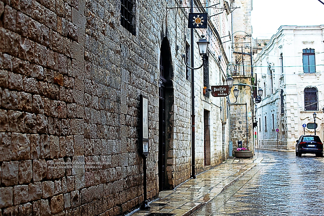 봄비가 오시면 보석으로 변하는 구도시(Centro storico) 전체는 대리석으로 건설됐다. 맨 처음 아드리아해를 바라보고 있는 "낙후된 어촌이려니.." 하고 생각한 도시의 실상은 십자군 전쟁의 주요 통로이자 무역의 중심지였으며, 그 유명힌 안니발레(Annibale) 장군의 깐네 전투(Battaglia di Canne)가 펼져진 깐네 평원(LA BATTAGLIA DI CANNE (216a.c.))이 지근거리(30km)에 위치한 곳이기도 하다.