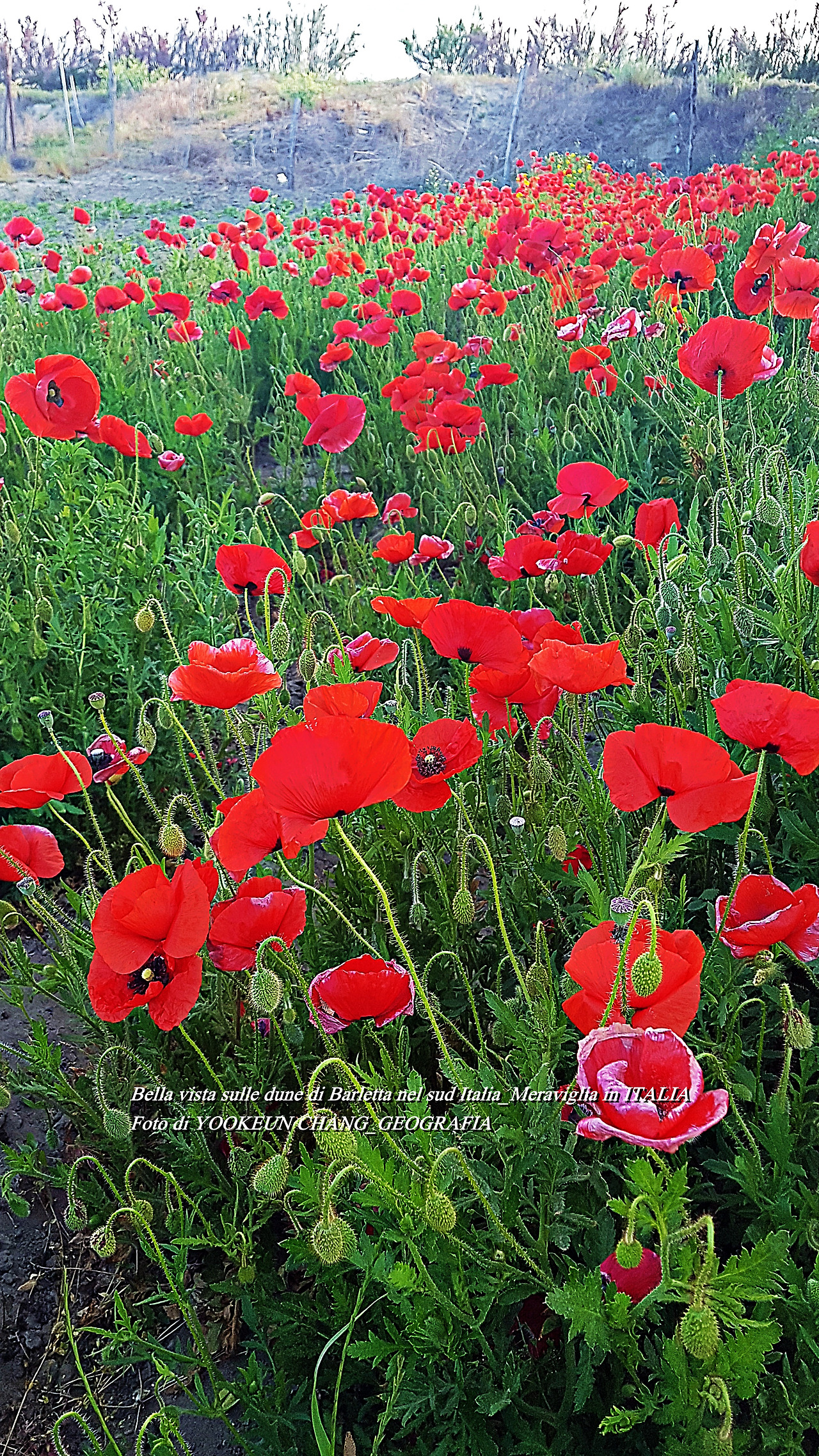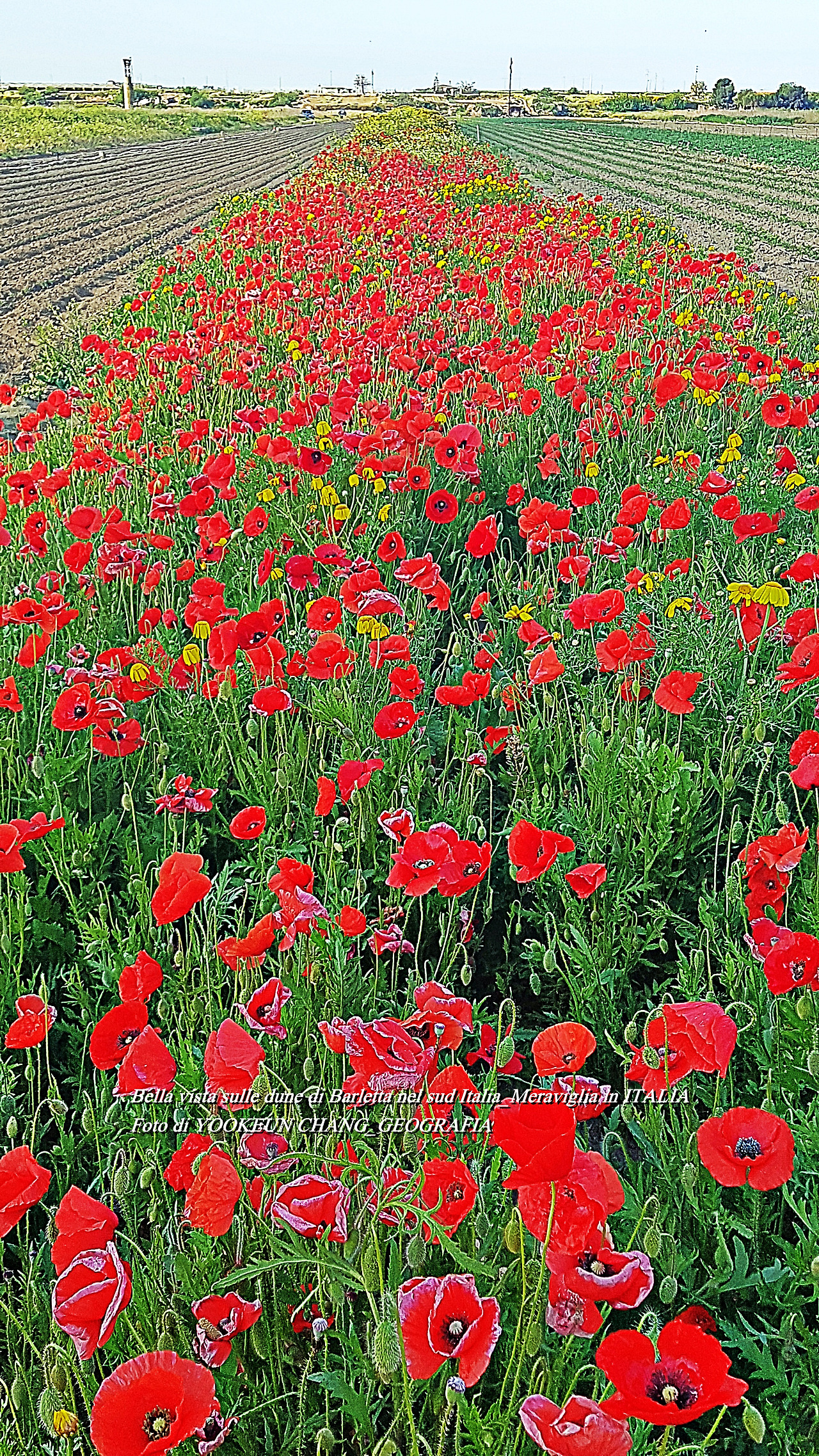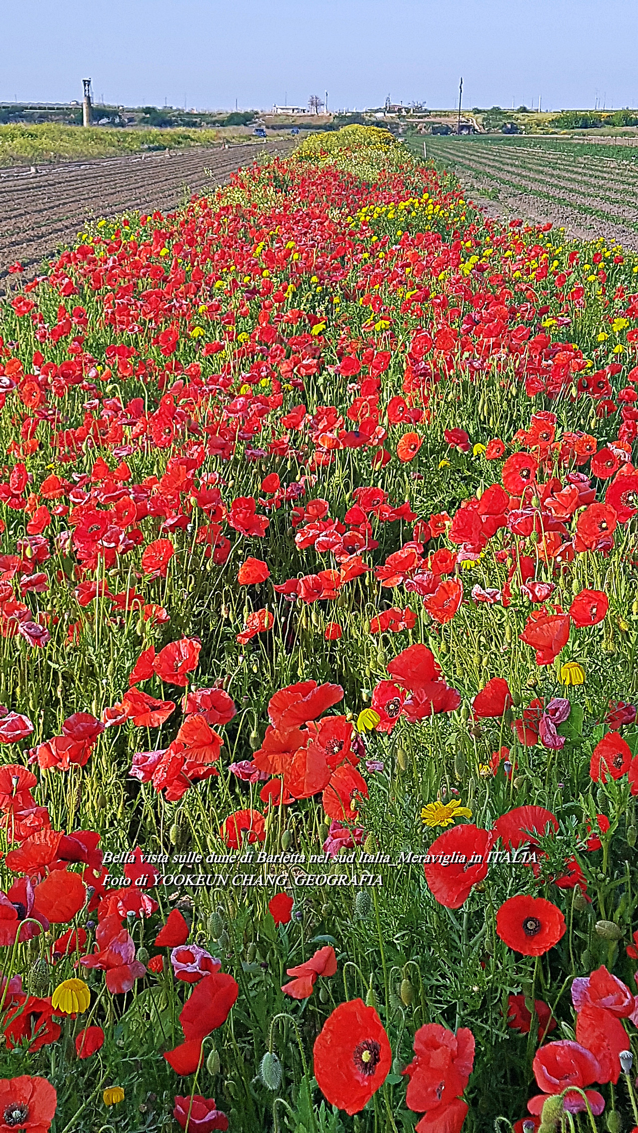 바를레타 사구의 밭이랑을 가로질러 길게 이어지고 있는 꽃양귀비 무리들..