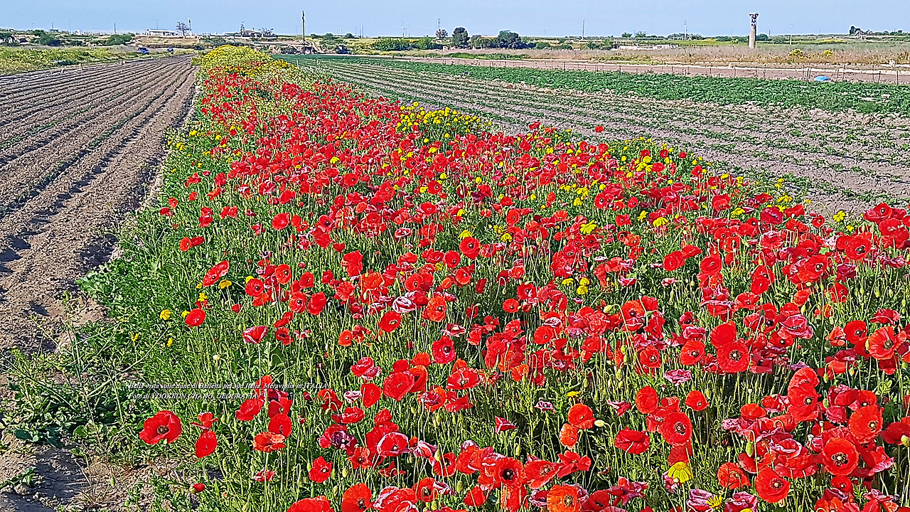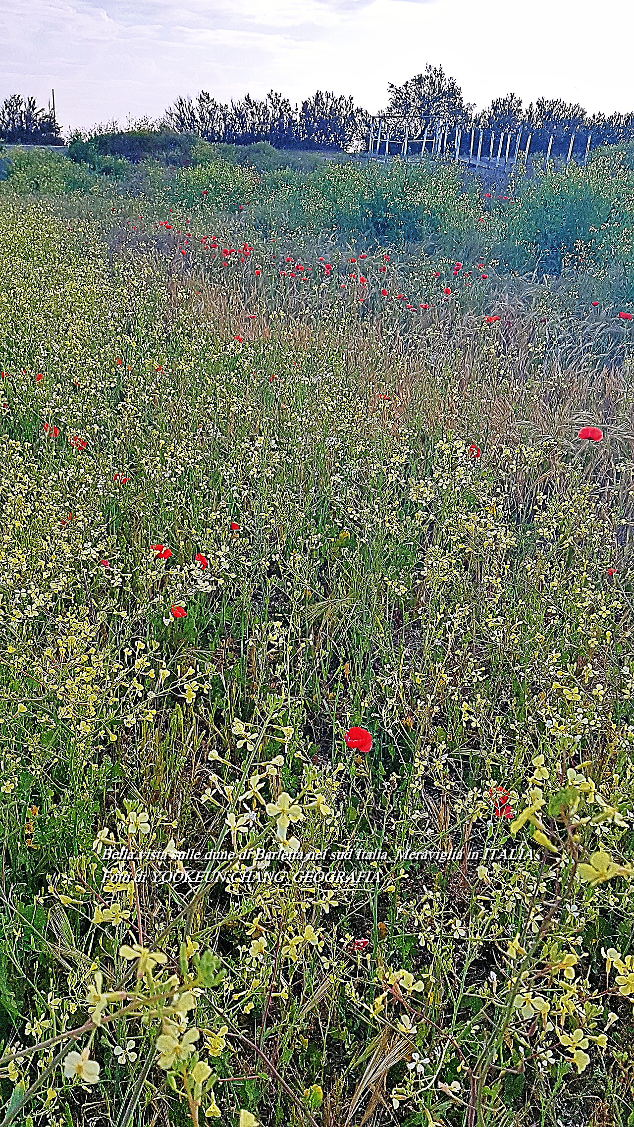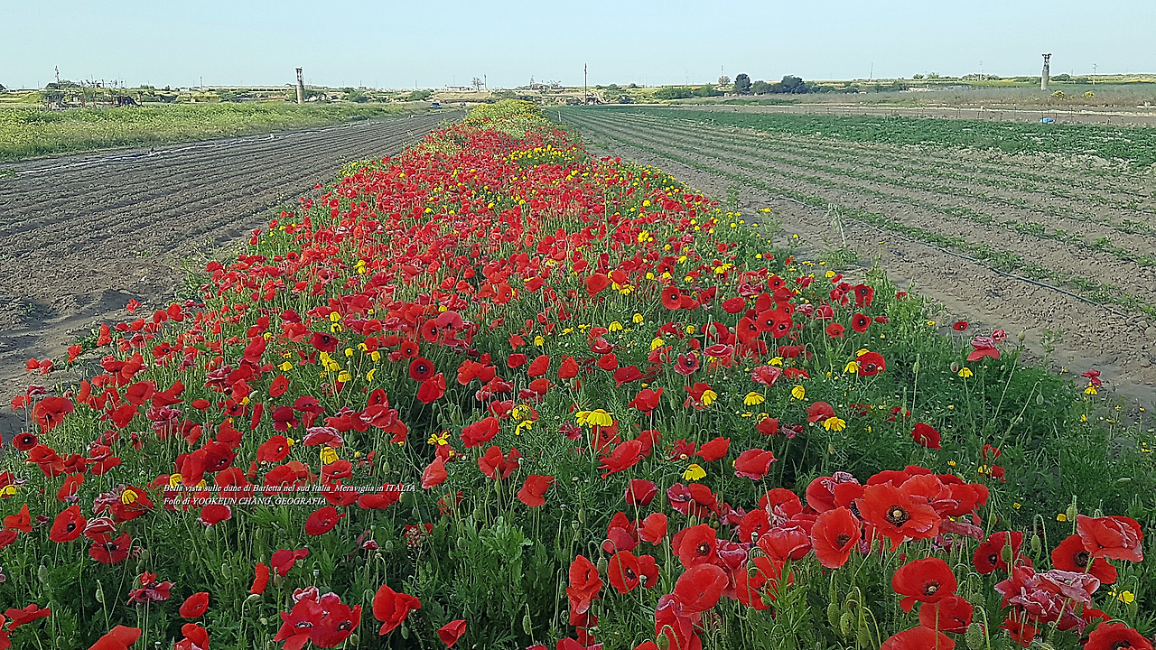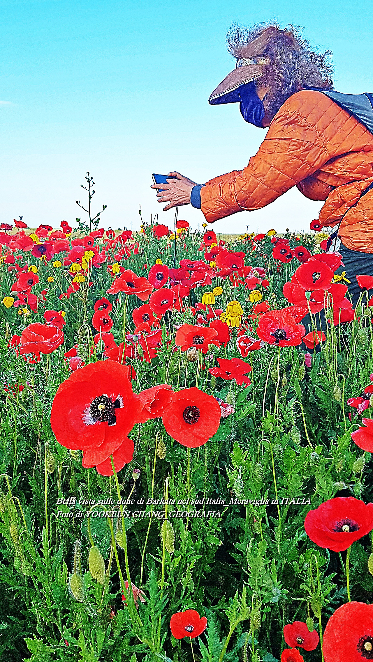 바를레타 사구의 밭이랑을 가로질러 길게 이어지고 있는 꽃양귀비 무리들..