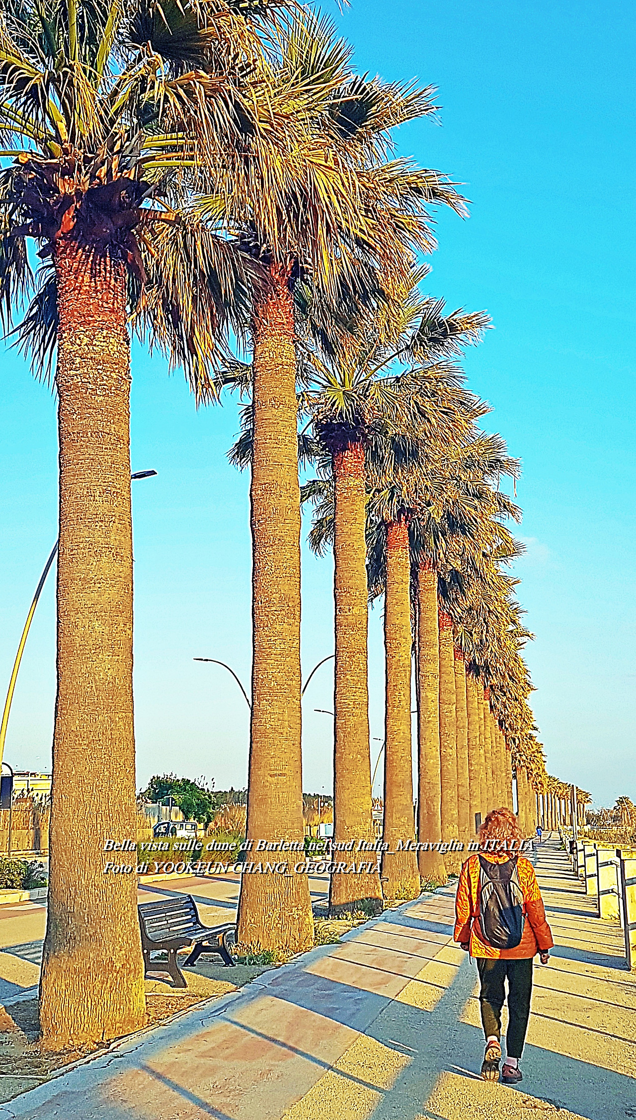 서기 2022년 5월 3일 오전 6시경(현지시각), 우리가 살고 있는 이탈리아 남부 뿔리아 주 바를레타의 바닷가 언덕이 발그레 물이 들었다. 저만치 아드리아해 곁으로 종려나무 가로수가 길게 이어져있는 낯익은 풍경.. 좌측 하단에 오렌지색 패딩 조끼를 입은 하니가 콘크리트 구조물 사이로 지나가고 있다. 바람은 멎고 해돋이는 이미 시작되었다. 이날 해돋이 시각은 05:49 분으로 목적지까지 다녀오려면 볕을 머리에 이고 다녀야 한다. 등에 맨 작은 보따리 속에는 커피 포트와 물병 한 개가 전부.. 산책 겸 봄나들이가 시작된 것이다.