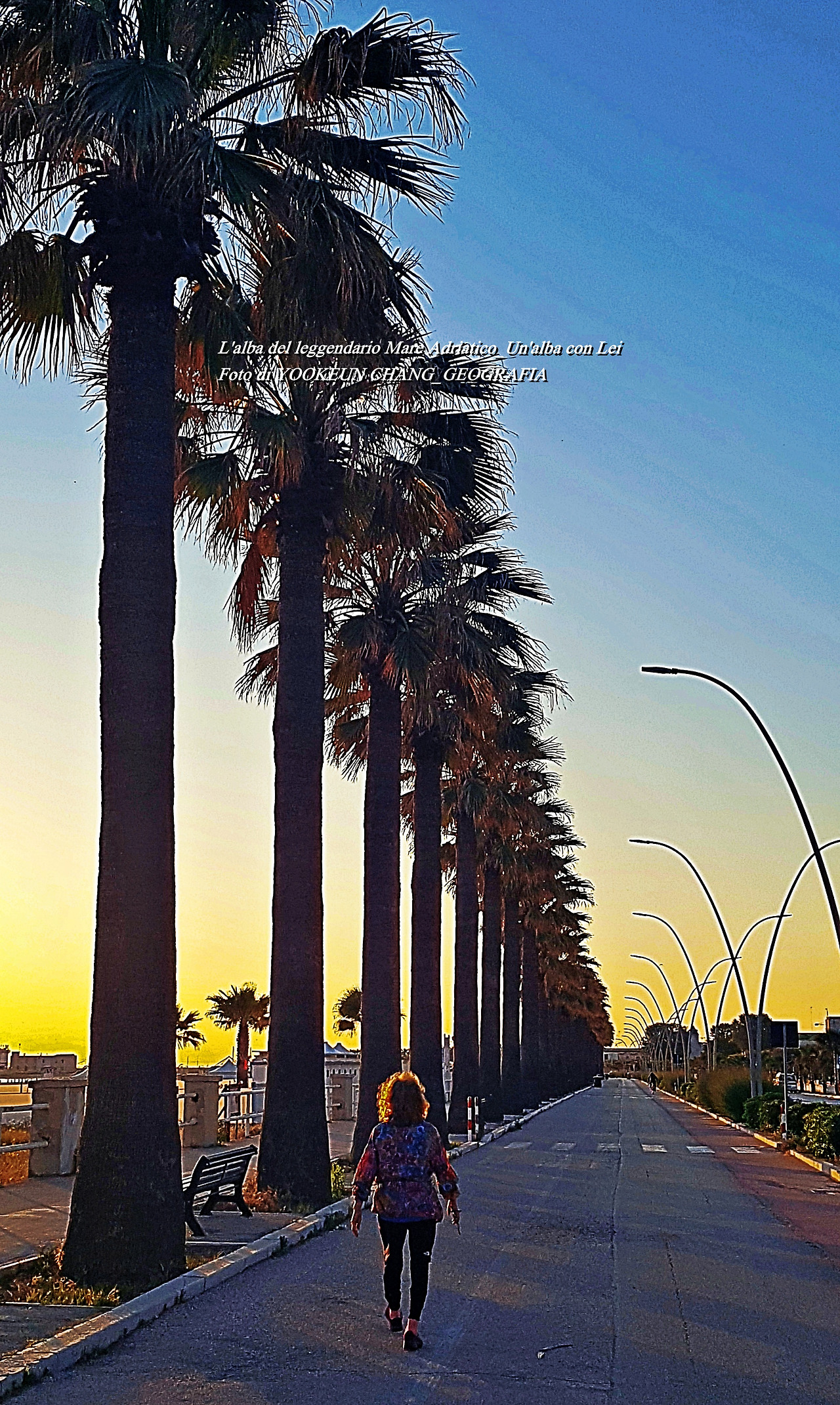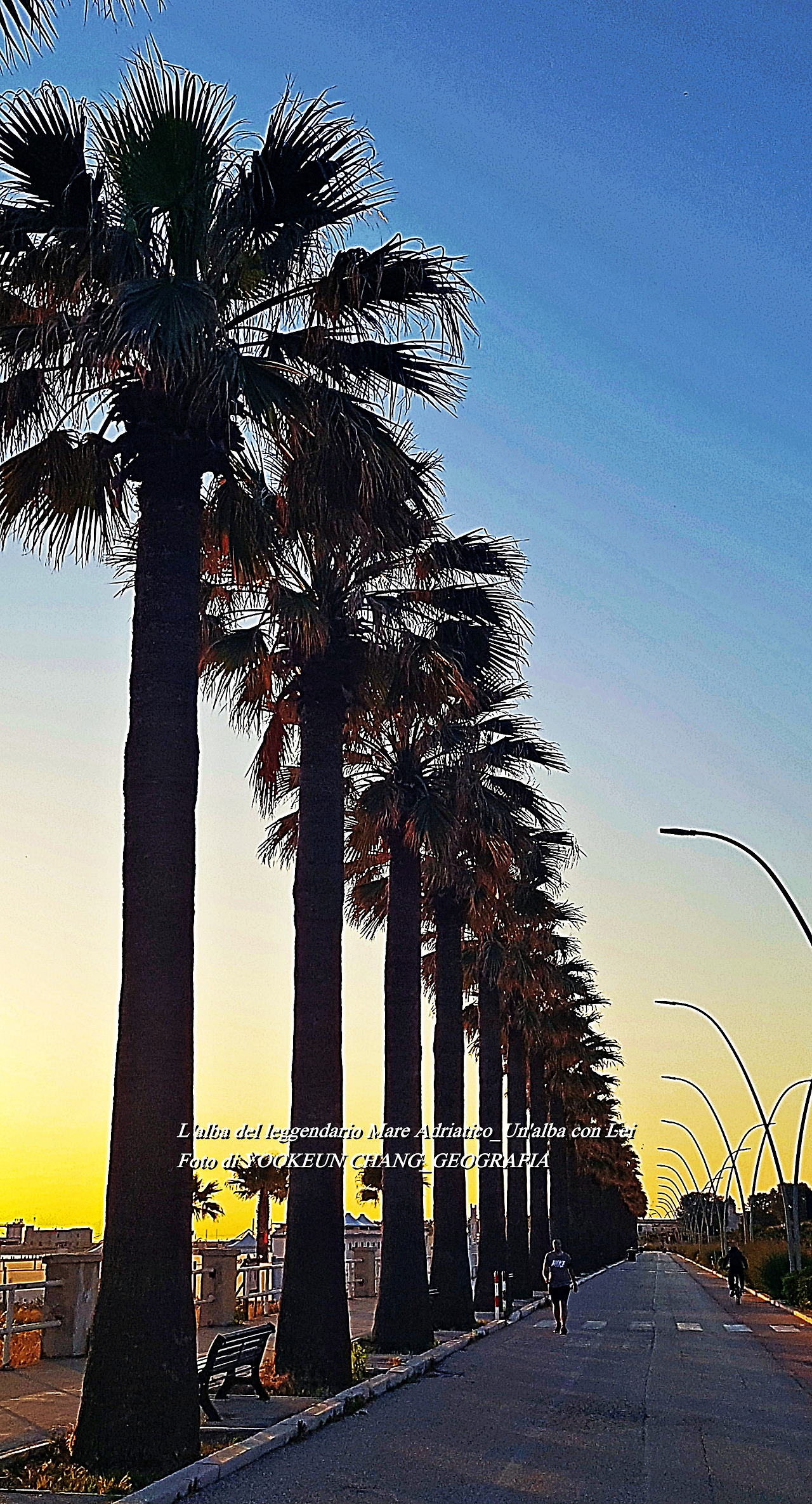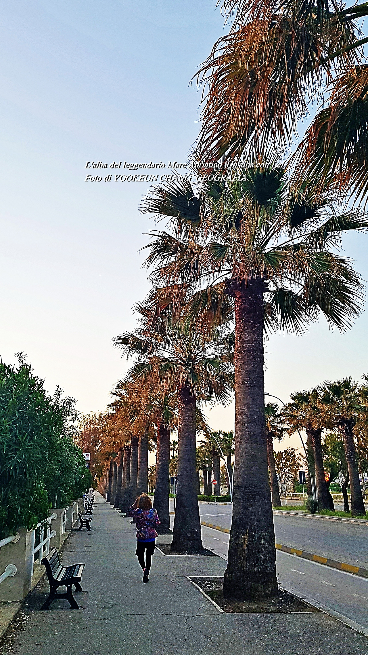 이날 아침, 종려나무 길이 끝나는 지점을 돌아 집으로 돌아가고 있다. 저 멀리 소실점에 바를레타 두오모가 뾰족하게 솟아있다. 조금 전 우리는 종려나무가 길게 늘어선 좌측 아래로 이동을 했다. 좌측이 발그레했던 바닷가..