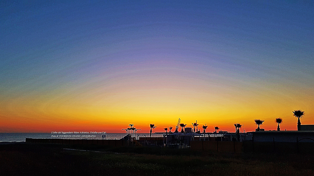 가로수길이 끝나는 지점에 도착할 무렵 아드리아해 너머로 본격적인 해돋이가 시작되었음을 알리고 있다. 노랗게 물든 지점이 해돋이가 시작되고 있다는 신호이자 하늘빛이 찬란하게 변하고 있다.