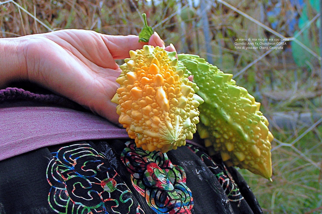 -여주(Momordica charantia)를 든 아내의 손과 치맛자락