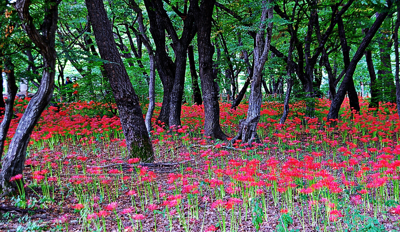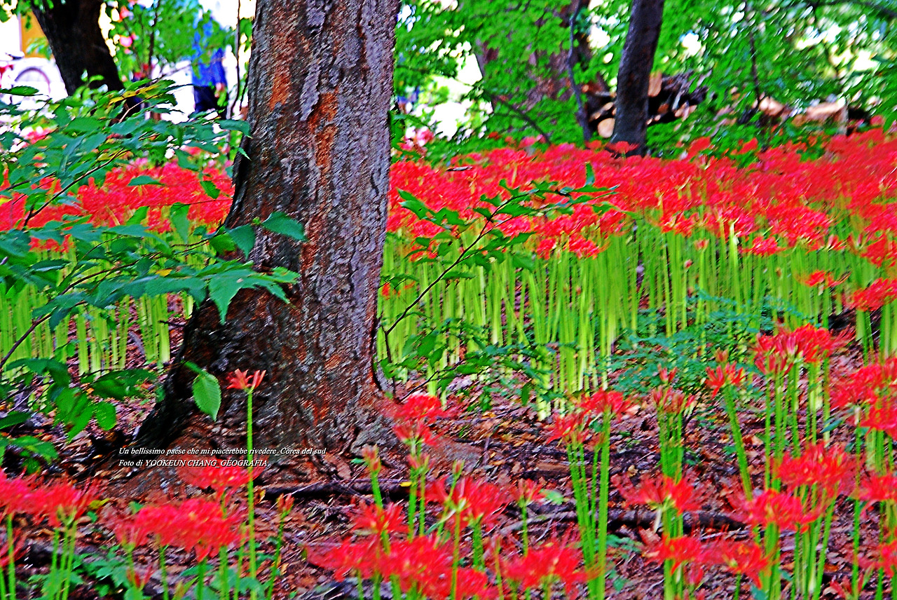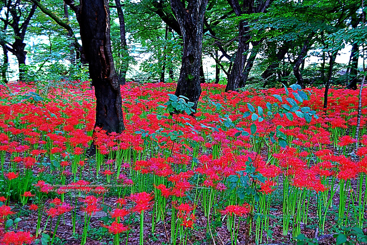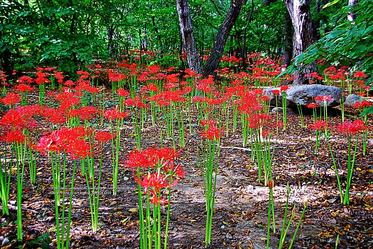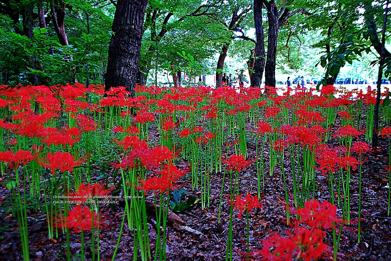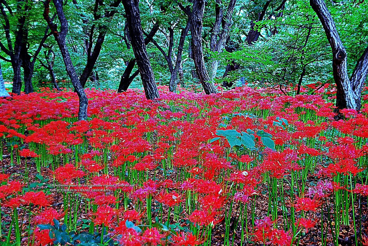 서기 2022년 6월 25일 저녁나절(현지시각) 우리가 살고 있는 이탈리아 남부 뿔리아 주 바를레타서 사진첩을 열어 핏빛 꽃무릇 무리를 보고 있다. 대한민국에 이런 풍경이 있었나 싶을 정도로 아름다운 풍경이다. 상림숲에서 잠시 떨어져 바라보면 숲 속에 이런 풍경이 있었나 싶을 정도로 평온한 모습이다.