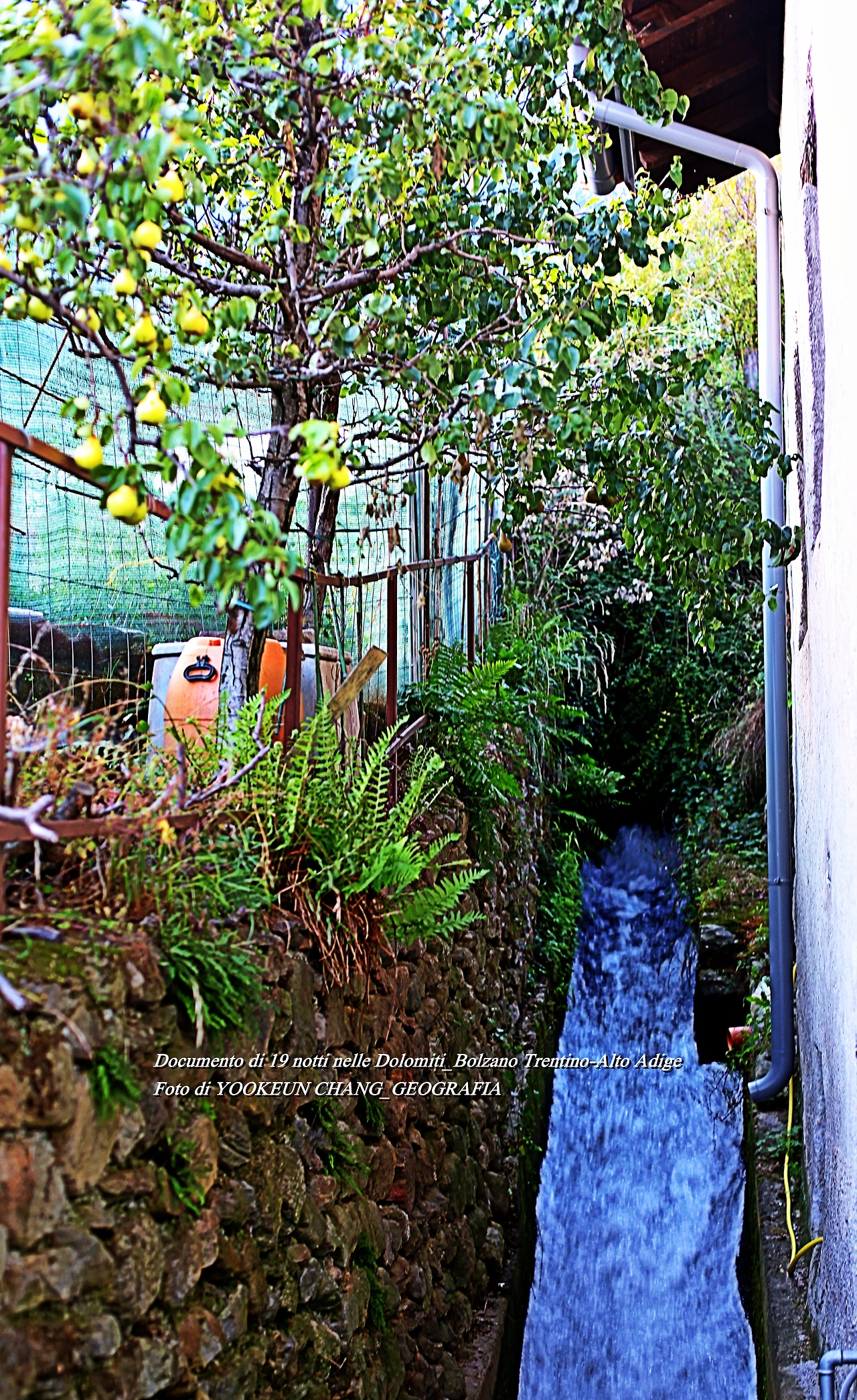 위 자료사진에 등장한 사과나무 한 그루 옆으로 급류가 흐르고 있다. 그럴 리가 없지만 누군가 급류에 휩쓸리면 사고를 당할 수 있을 정도이다. 하수구처럼 생긴 급경사의 수로는 기한제처럼 작용해 근처에 가면 냉기가 느껴진다. 이곳의 곳곳에 이런 수로가 만들어져 있고 농수로로 이용하고 있었다. 물은 맑고 차며 그냥 마셔도 좋을 정도로 깨끗했다.