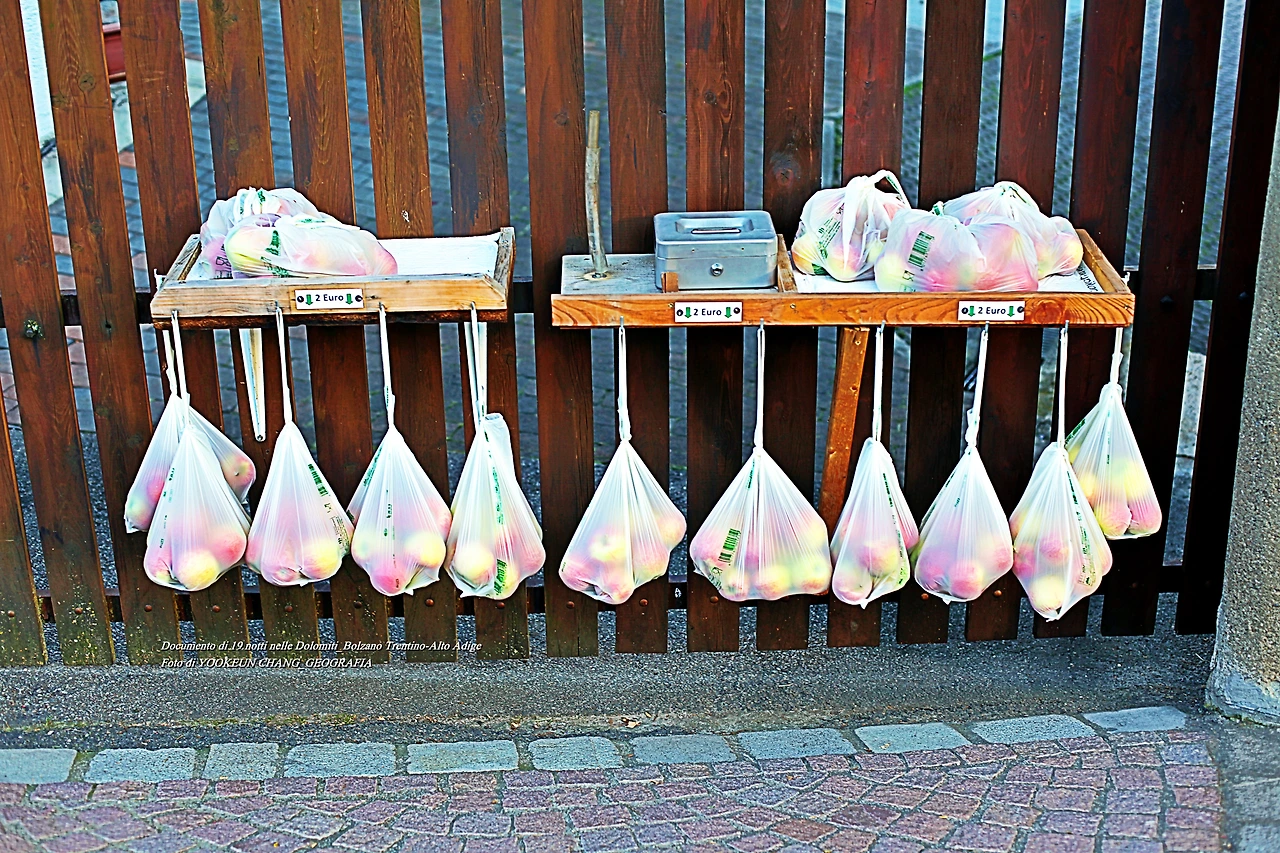사과 한 봉지 가격은 2유로.. 굵직한 사과 예닐곱 개를 담은 특산물 가게.. 이곳의 사과 맛은 매우 특별하다. 사과 재배에 적정한 토양과 기후 등이 특별한 사과 맛을 내는 것이다. 요즘 우리나라에서 보기 힘든 사과 과수원이 메라노 전 지역에 분포한다면 얼마나 멋진 광경일까.. 다음 포스트에 그 광경을 담아 공유하고 싶다.