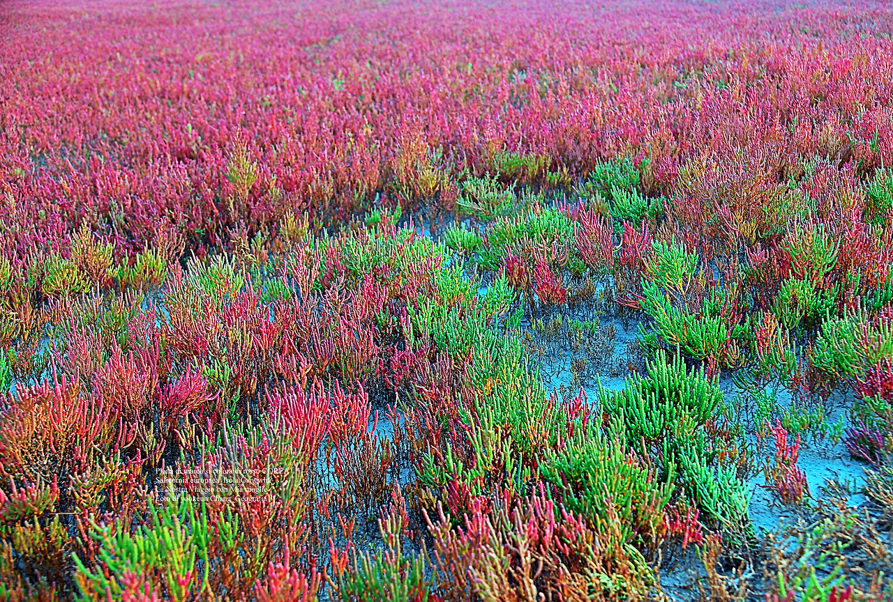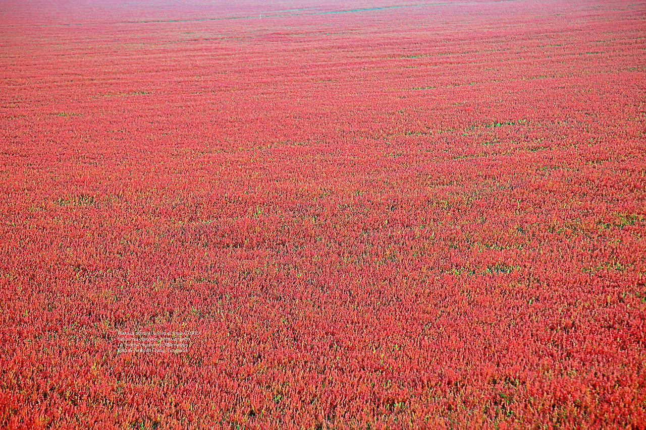 드넓은 개펄 위를 붉게 물들인 함초 풀(퉁퉁마디_Salicornia europaea)은 붉게 물들면서 바싹 말라가고 있었다. 그리고 아직도 덜 마른 개펄 위에는 연두색으로부터 초록색은 물론 노랗고 빨갛게 보랏빛 등 무지개 빛으로 어우러져 푸른빛을 띤 개펄과 기막히게 어우러지고 있었다.
