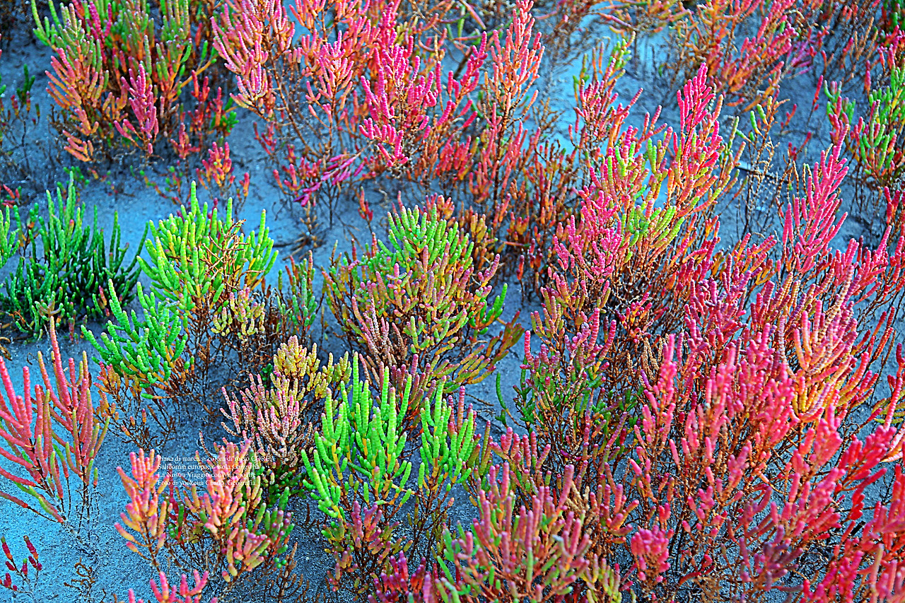 Cresce in folti gruppi di individui, formanti un tappeto vivacemente colorato sopra il terreno umido e salmastro. Esistono molte specie simili che possono essere riconosciute solo con difficoltà.