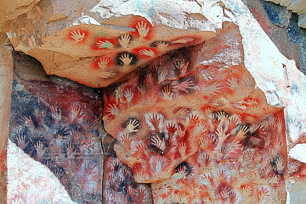 La Caverna si trova nella valle del fiume Pinturas, in un luogo isolato della Patagonia a circa 100 chilometri dalla strada principale. Essa è famosa (e infatti a questo deve il suo nome) per le incisioni rupestri rappresentanti mani, che appartenevano al popolo indigeno di questa regione (probabilmente progenitori dei Tehuelche), vissuto fra i 9.300 e i 13.000 anni fa. Gli inchiostri sono di origine minerale, quindi l'età delle pitture rupestri è stata calcolata dai resti degli strumenti (ricavati da ossa) usati per spruzzare la vernice sulla roccia.