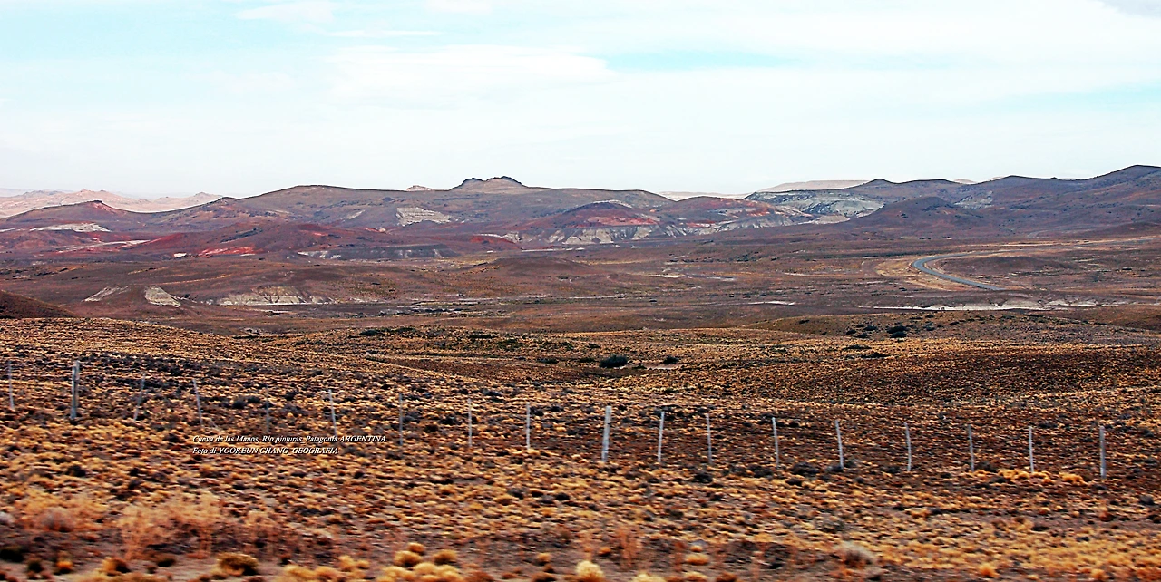 그러나 우리가 흔히 못 보던 판타스틱한 장면이 길게 연출되고 있는 것이다. 풍경은 택시(전세) 속에서 바라본 것들이며 필요한 경우 줌을 잡아당겨 찍었다. 이런 풍경은 사진 중에 등장한 평원 너머 중간에 우뚝 서 있는 암봉이다. 암봉 아래는 계곡이 이어지고 있으며 면저 설명한 리오 삔뚜라스(Rio pinturas)강의 발원지로부터 시작해 매우 아름답고 드넓고 거대한 계곡이 숨겨진 곳이다. 그곳에 1만 년 전에 살았던 원시인들의 거주지였던 동굴과 함께 엊그제 그린 것 같은 생생한 손바닥 그림이 그려져 있는 것이다. 다시 한번 더 미리 보면 이러하다.