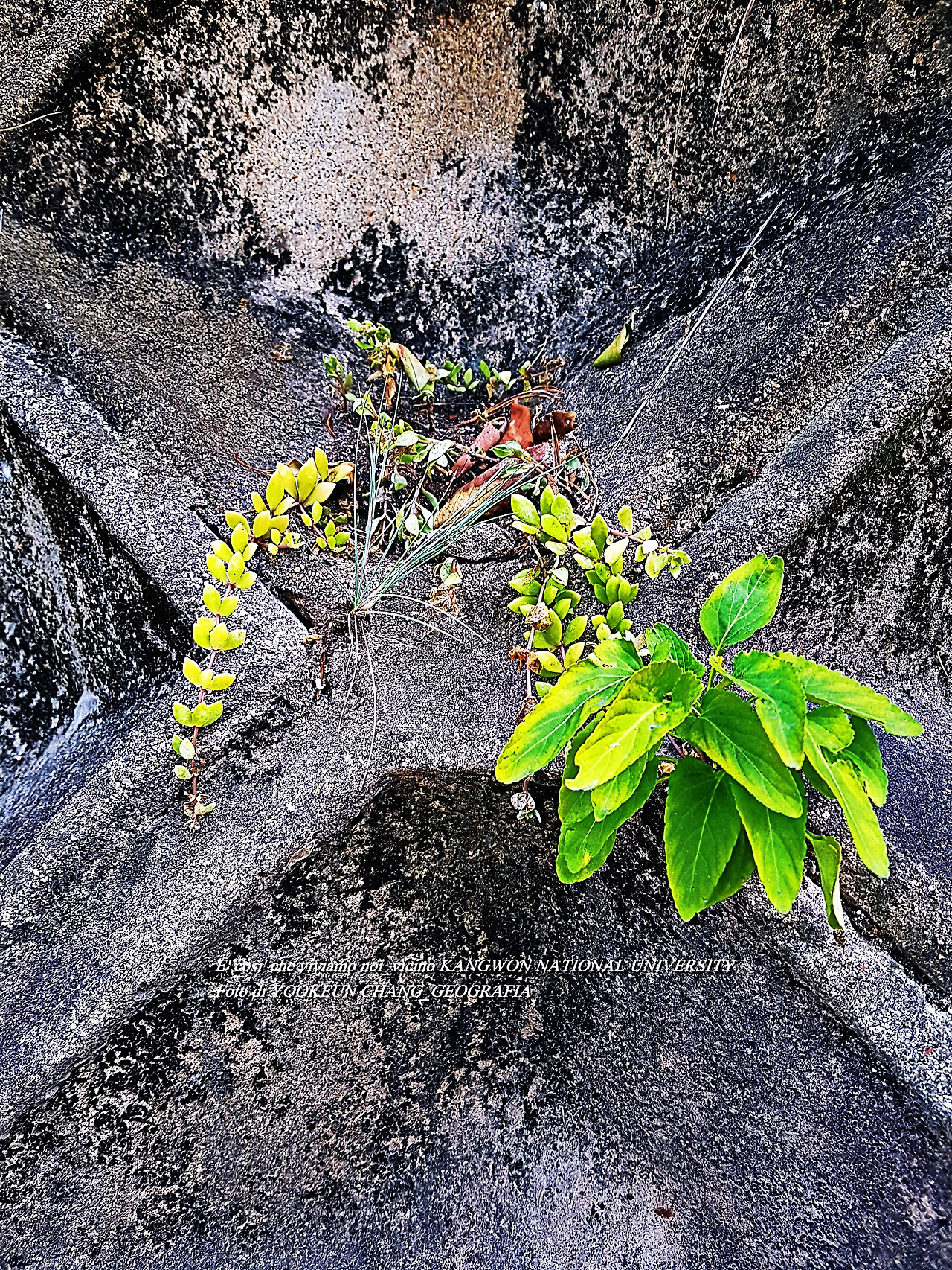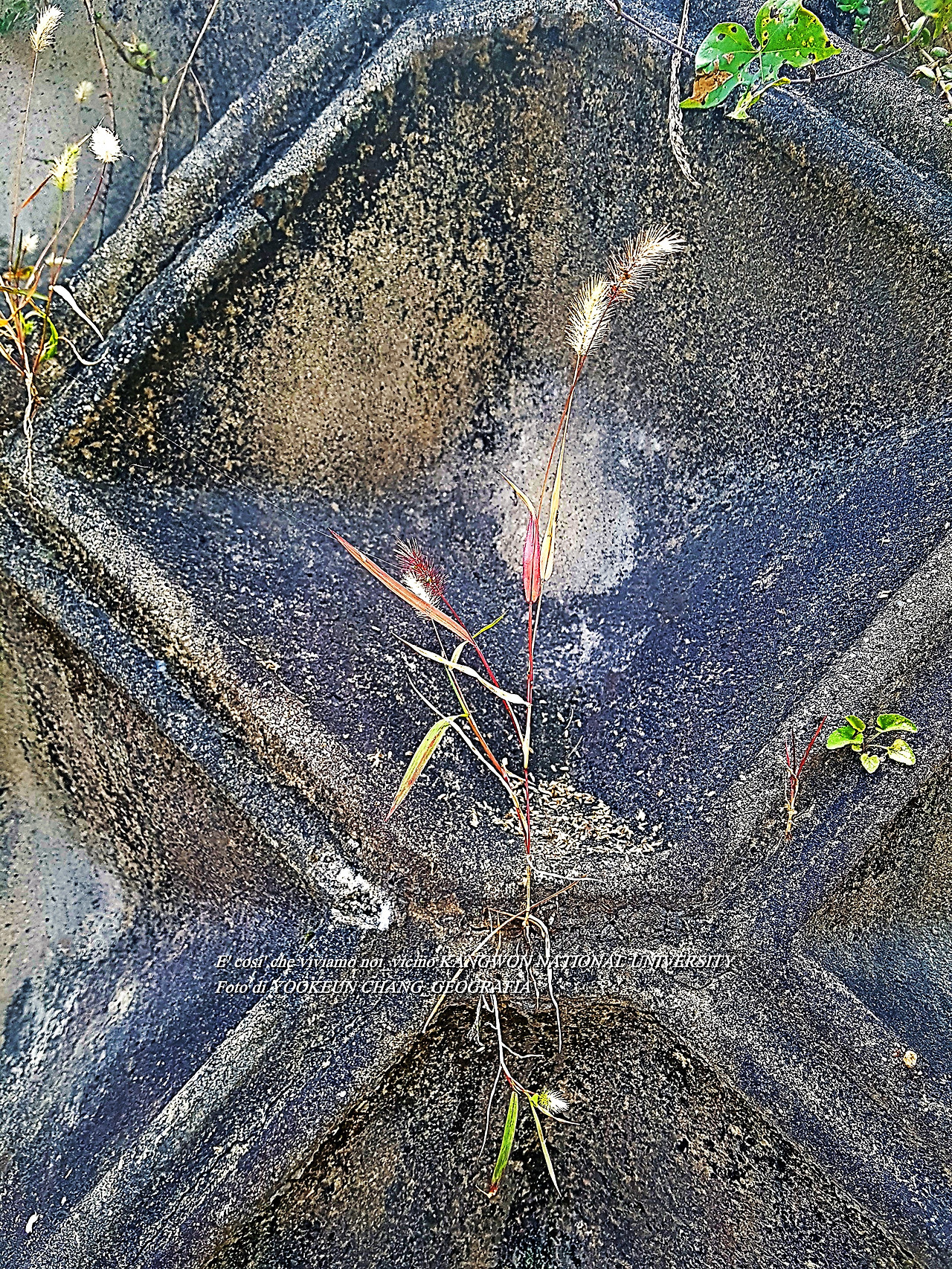 서기 2022년 9월 28일 오후, 느리게 느리게 볼 일을 마친 후 집으로 돌아가는 길에 만난 아름다운 풍경 앞에서 발길을 멈추었다. 뷰파인더 앞에는 시멘트로 만든 블록 좁은 틈바구니에서 식물들이 살아가고 있었다. 녀석들은 9월 어느 날 그들을 닮은 한 사람을 바라보고 있다.