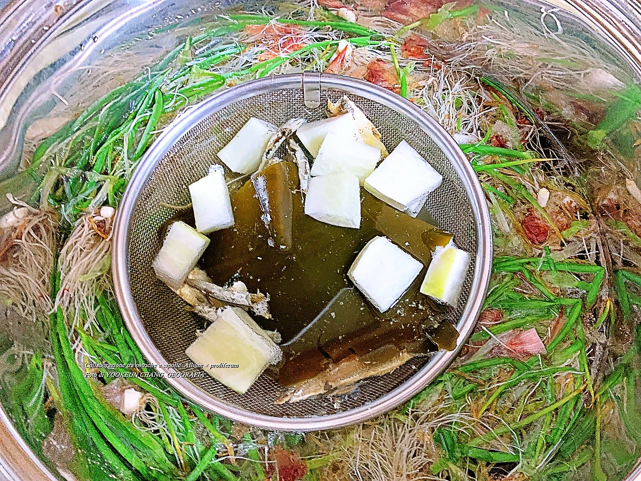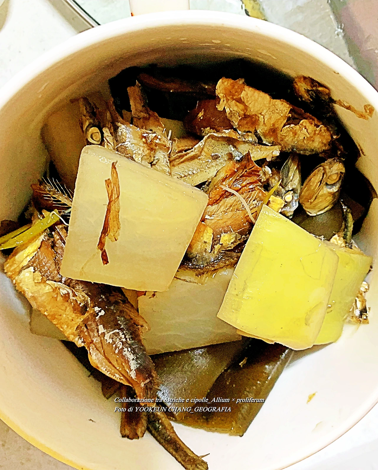 최초 쪽파를 한소끔 끓인 육수 위에 다시마와 멸치 한 줌을 올리고 사우나를 흠뻑 쇠게 했다. 최초 센 불로 끓이다가 약불로 줄인 다음 무 조각을 넣고 대략 1시간 정도 졸였다.
