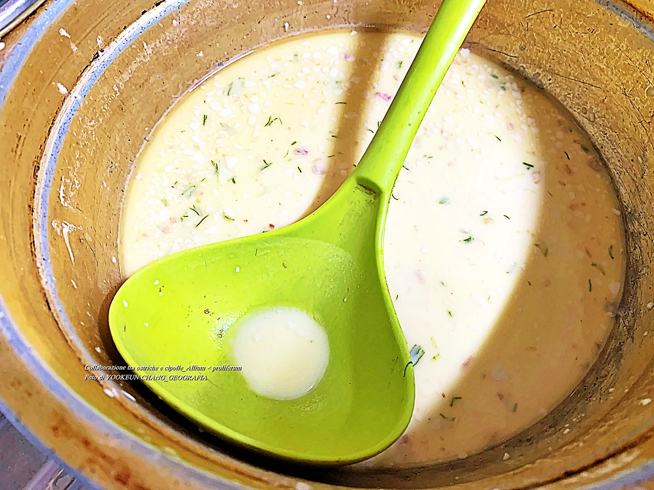 우리가 잘 먹는 부침개 혹은 각종 전에 사용되는 밀가루 반죽은 주로 맹물을 사용하거나 양파 당근샐러리(양당새) 육수를 사용하게 된다. 생선은 물론 해산물 킬러인 나의 고향은 부산.. 부산에서 유명한 파전의 이름은 동래파전이다. 만드는 과정이 매우 간단하고 맛은 기가 막힌다. 쪽파를 커다란 불판에 올려놓고 밀가루 반죽 혹은 계란을 올려놓고 그 위에 오징어 등 해산물을 올려 구워낸다.