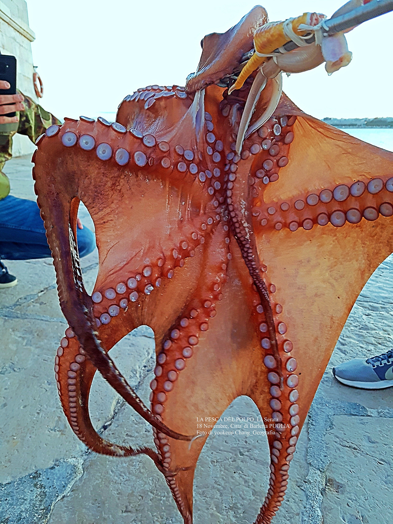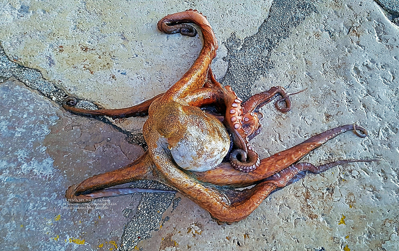 어제(18일 현지 시각) 오후, 글쓴이가 살고 있는 이탈리아 남부 뿔리아 주 바를레타에서 재밌는 장면을 목격하고 사진과 영상으로 기록을 남겼다. 자료사진에서 확인되는 것처럼 큼지막한 문어 한 마리가 뭍으로 생포되어 온 것이다. 이 문어의 크기는 대략 5킬로그램 정도 되는 것으로 현지에서 내가 본 문어들 중에 가장 큰 녀석이었다. 얼핏 보기엔 한국의 동해산 대왕문어처럼 보였지만 이탈리아 반도에서 잡히는 문어들은 다 고만고만한 크기였다.