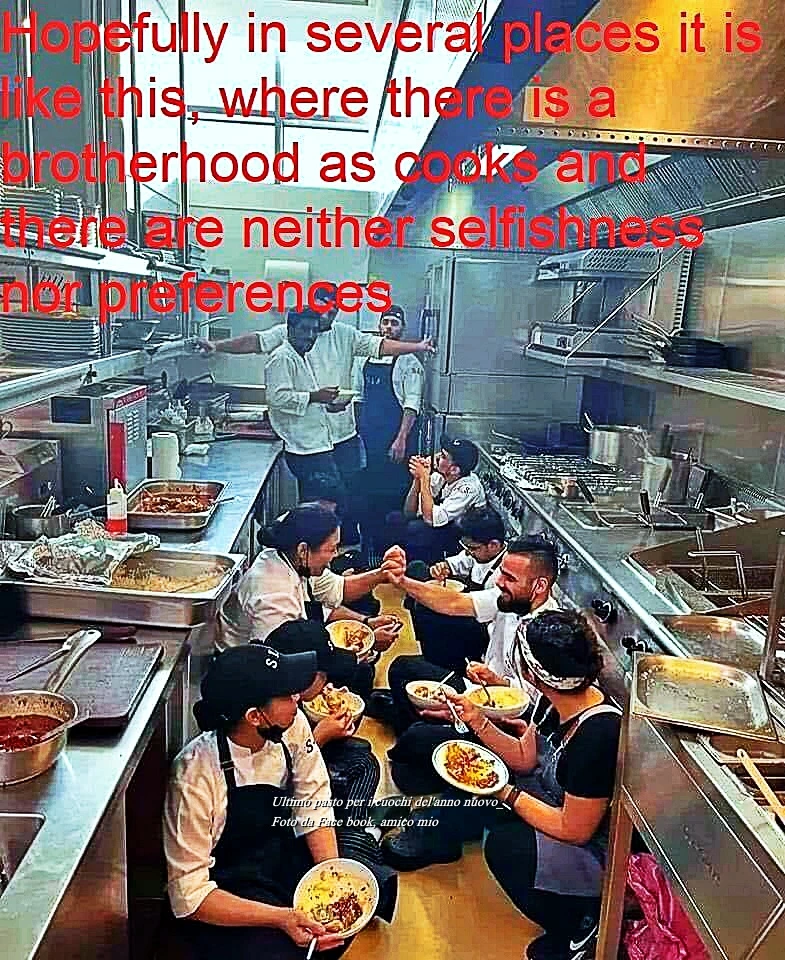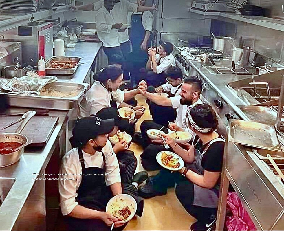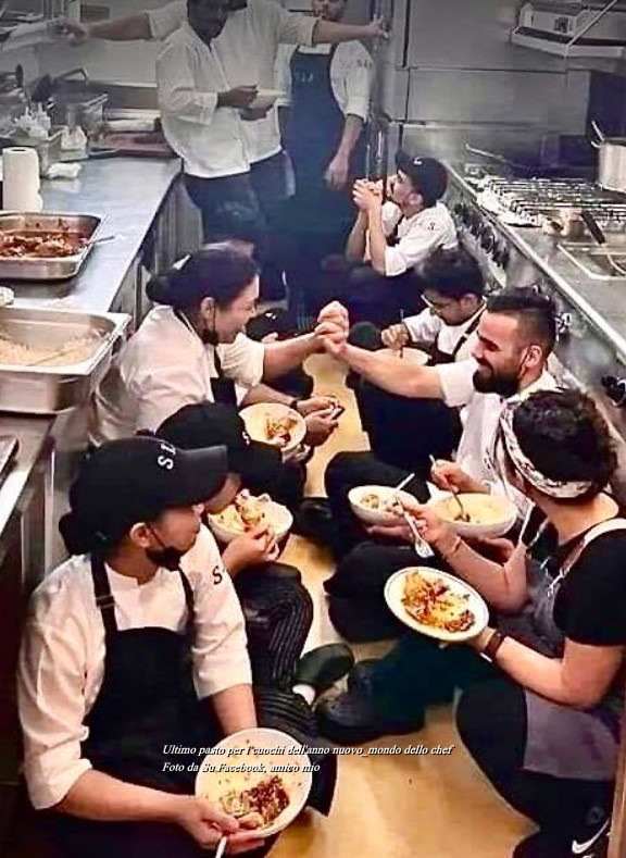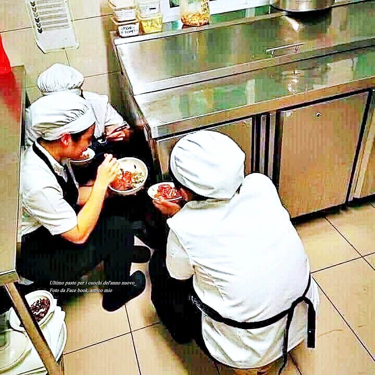 요리사들이 주방에서 쪼그리고 앉아 식사를 하는 모습은 평소에 전혀 만날 수 없는 귀한 풍경이다. 이런 풍경이 가능할 경우의 수는 송구영신.. 연말연시가 되어 일손이 바빠 잠시 쉴 수 있는 시간(Pausa, 빠우자)를 놓쳤기 때문이다. 그리고 주방에는 따로 요리사들이 밥을 먹을 수 있는 공간이 없다. 그리하여 셰프의 배려로 퍼질고 앉아 주린 배를 채우는 것이다. 참 아름다운 사람들.. 지난 한 해 너무 수고가 많았다. 새해가 밝아오면 훨훨 날으시기 바란다.