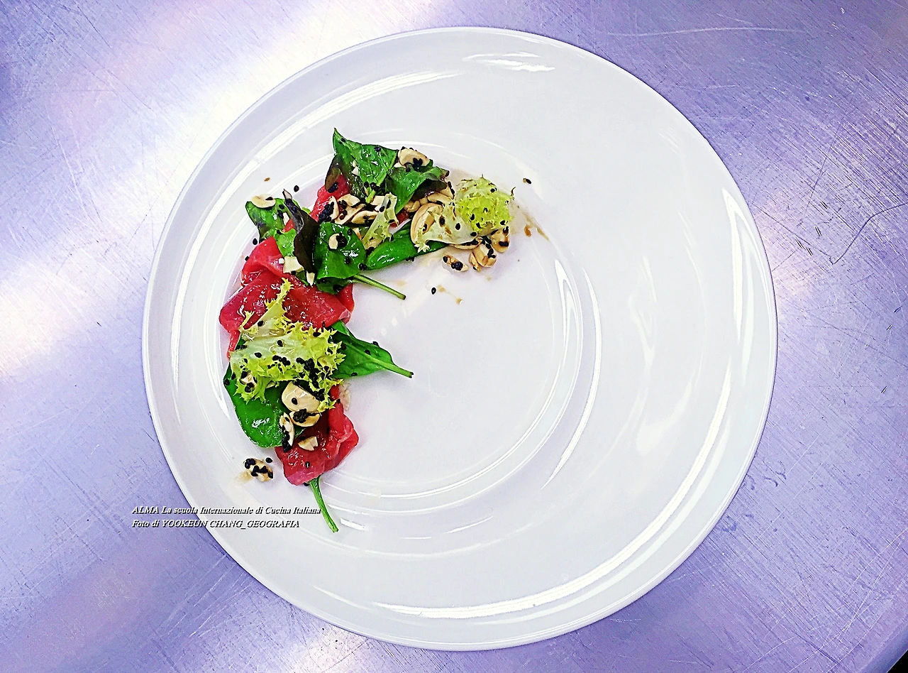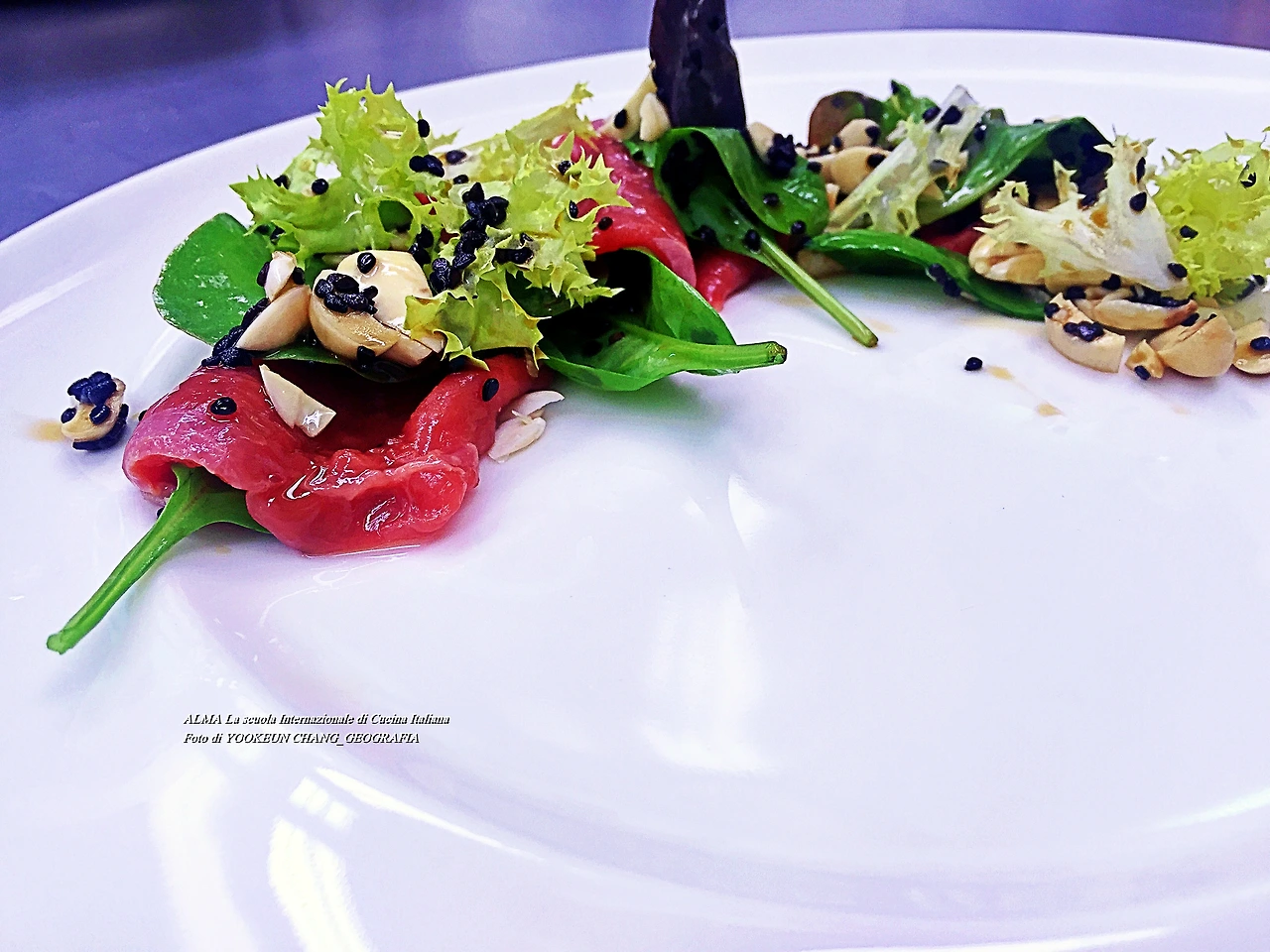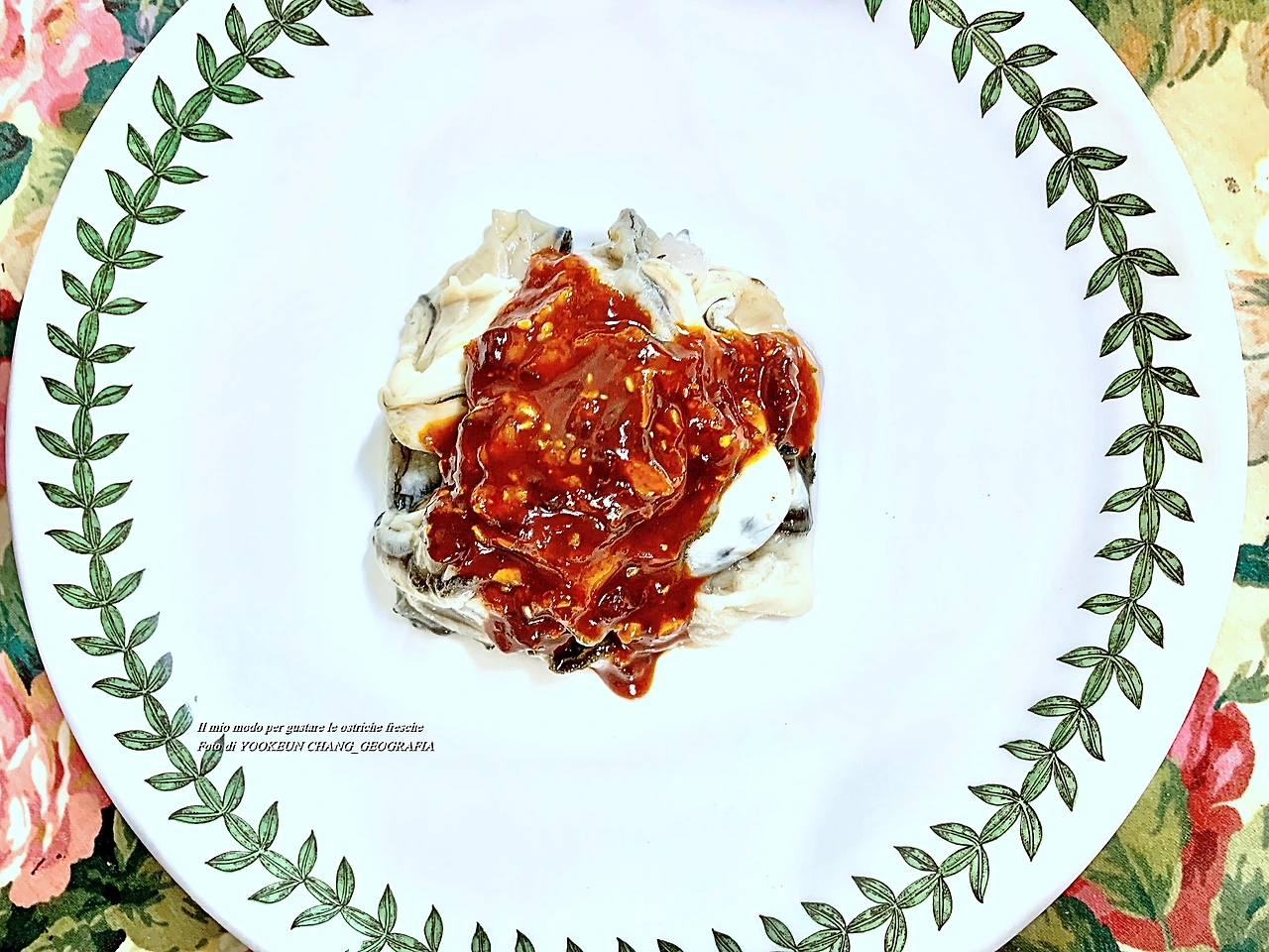 접시 위의 장식(DECORAZIONE)을 잘 살펴보면 보색대비와 채색대비가 뒤섞여있다. 틈새를 장식하는 잘디 잔 식재료들은 깨소금이나 호두 혹은 잣 등으로 흩뿌리면 보기 좋고 생굴에서 맛보지 못한 특별한 맛을 느끼게 되겠지..