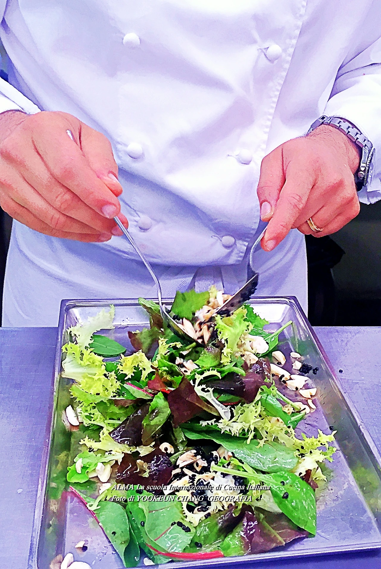 위에서 잠시 만난 셰프가 샐러드를 만들고 있다. 식재료들은 따로 설명하지 않아도 단박에 알 수 있는 것들로 질 좋은 올리브유와 소금 후추 등을 흩뿌려 잘 섞어주면 끝!