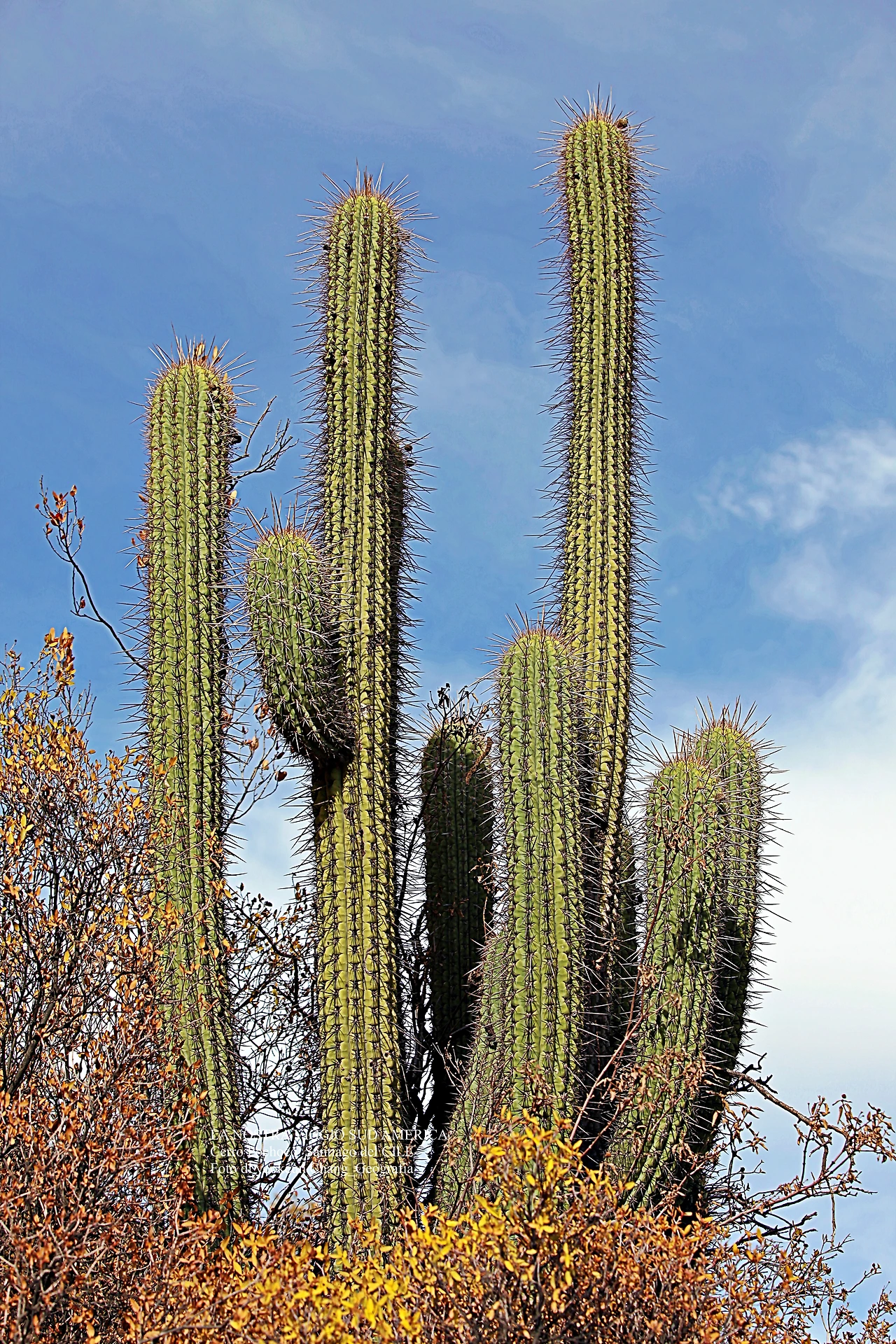그런데 우리가 첫발을 내디딘 안데스 산맥의 세로 포초코는 흙산도 아니었고, 돌산도 아니었으며, 악산은 더더욱 아니었다. 건기의 세로 포초코는 바짝 마른 한편 대부분의 나무들이 단풍이 들어 잎을 떨구고 있었다. 그 가운데 건기를 즐기기라도 할 듯이 큼지막한 선인장들이 곳곳에 우뚝 서 있는 것이다.