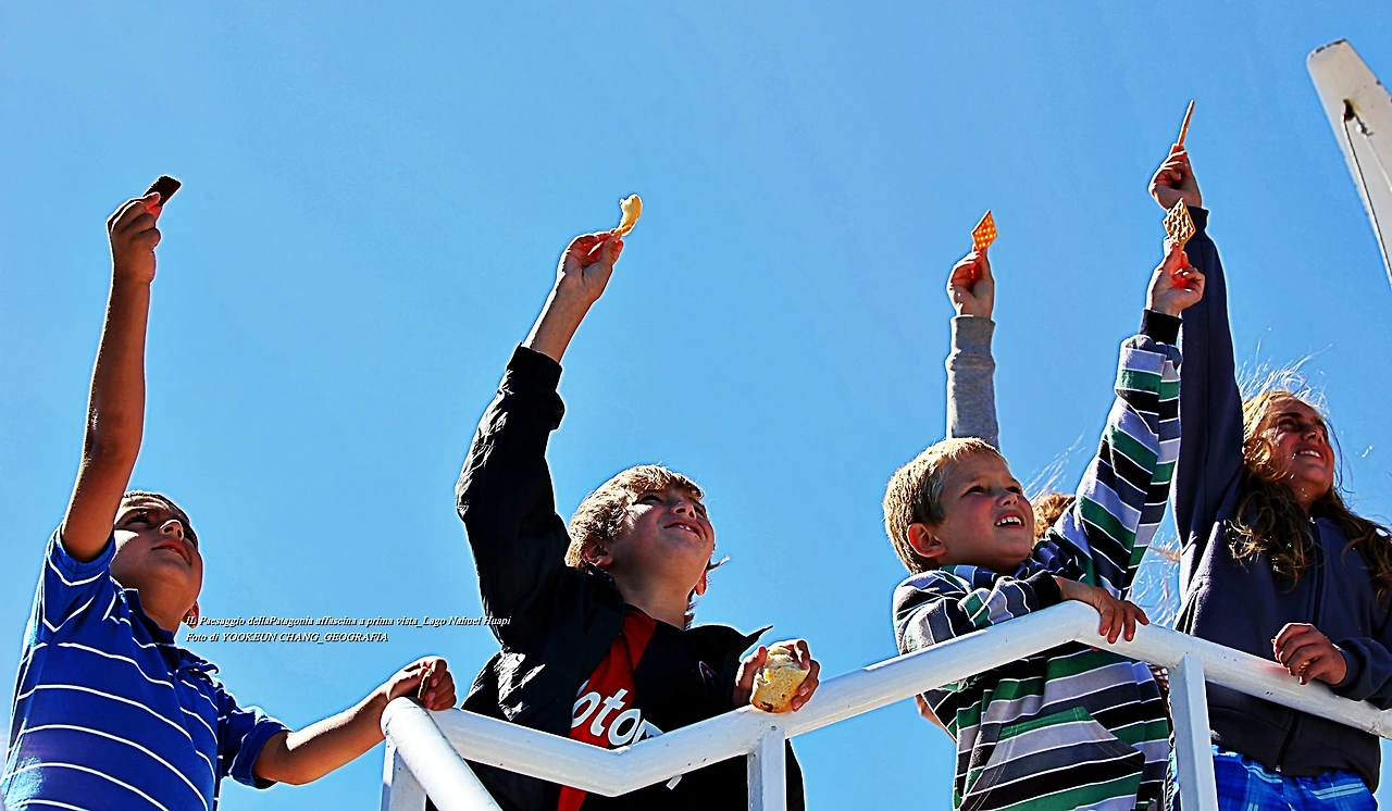 아이들이 유람선 상갑판에 올라 비스킷을 들고 갈매기를 유혹하고 있다.