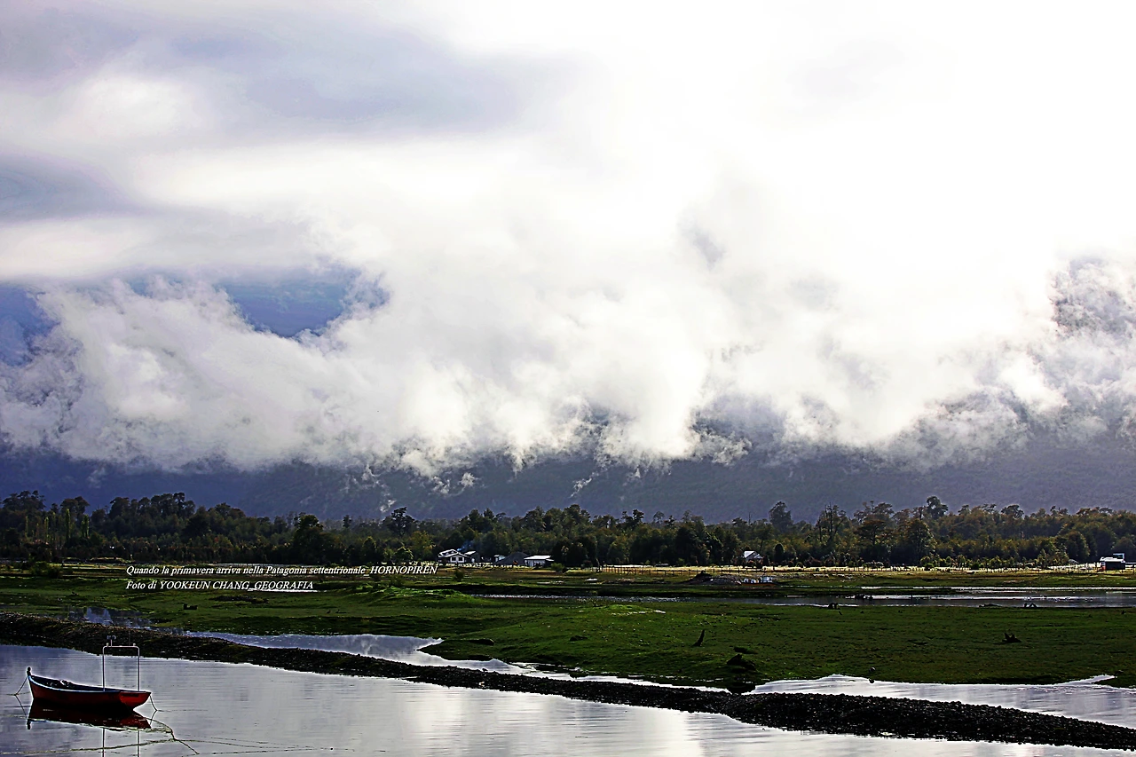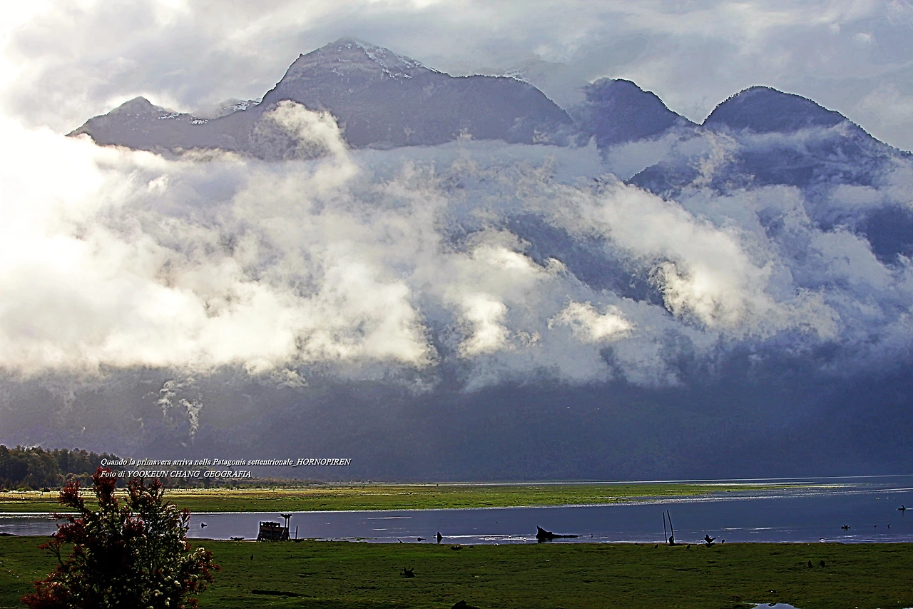 밀물 때의 북부 파타고니아 로스 라고스 주 오르노삐렌의 삼각주에 서린 안개비와 구름과 안데스 산맥의 풍광이 촉촉이 젖어 오늘따라 슬퍼 보인다. 우기와 건기가 번갈아 가며 곧 우기는 저 멀리 사라질 것이다.