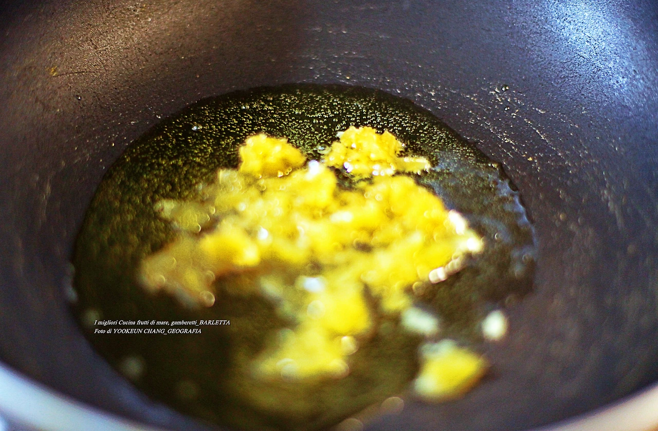 팬 위에 뿔리아 주에서 생산한 최고급 올리브유를 적당량 두르고 마늘기름을 만든다.(킁킁.. 쥑인다,ㅜ)