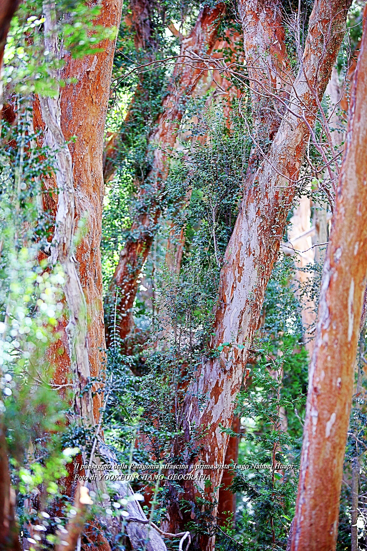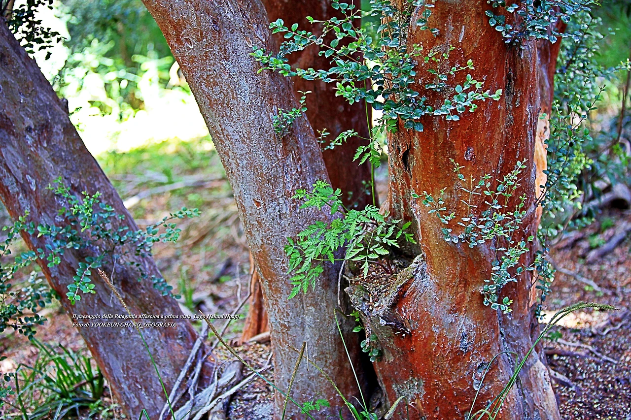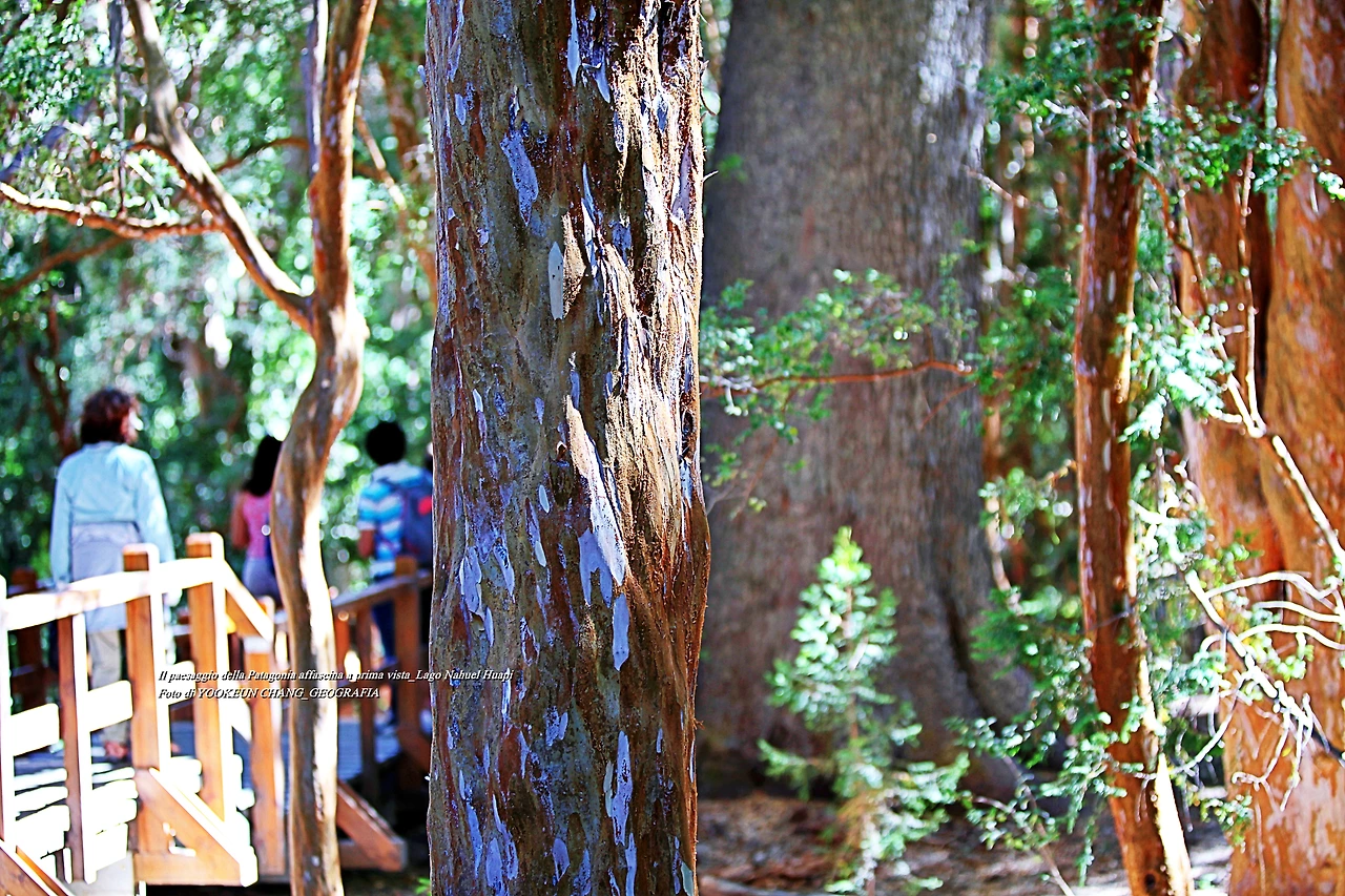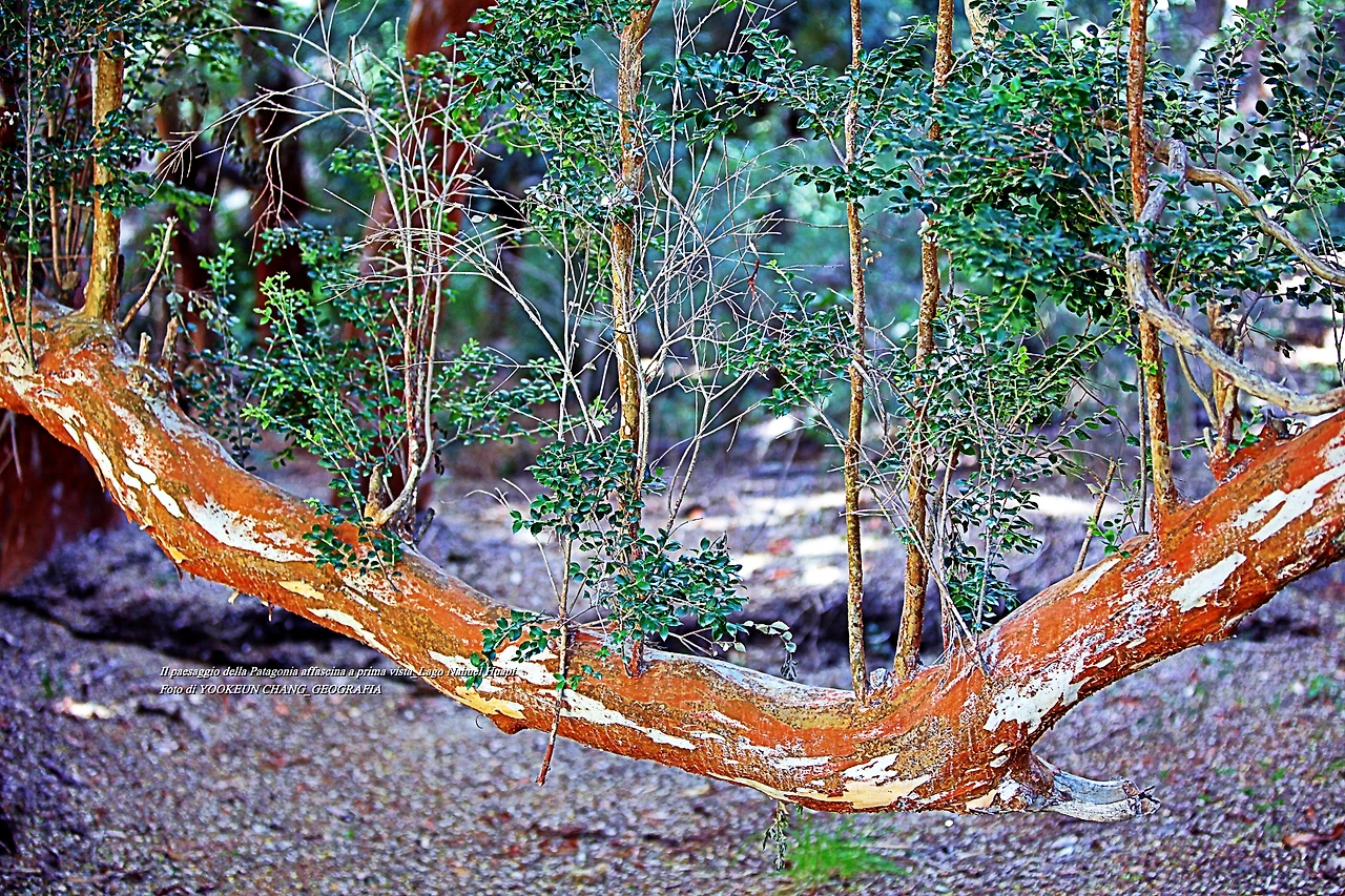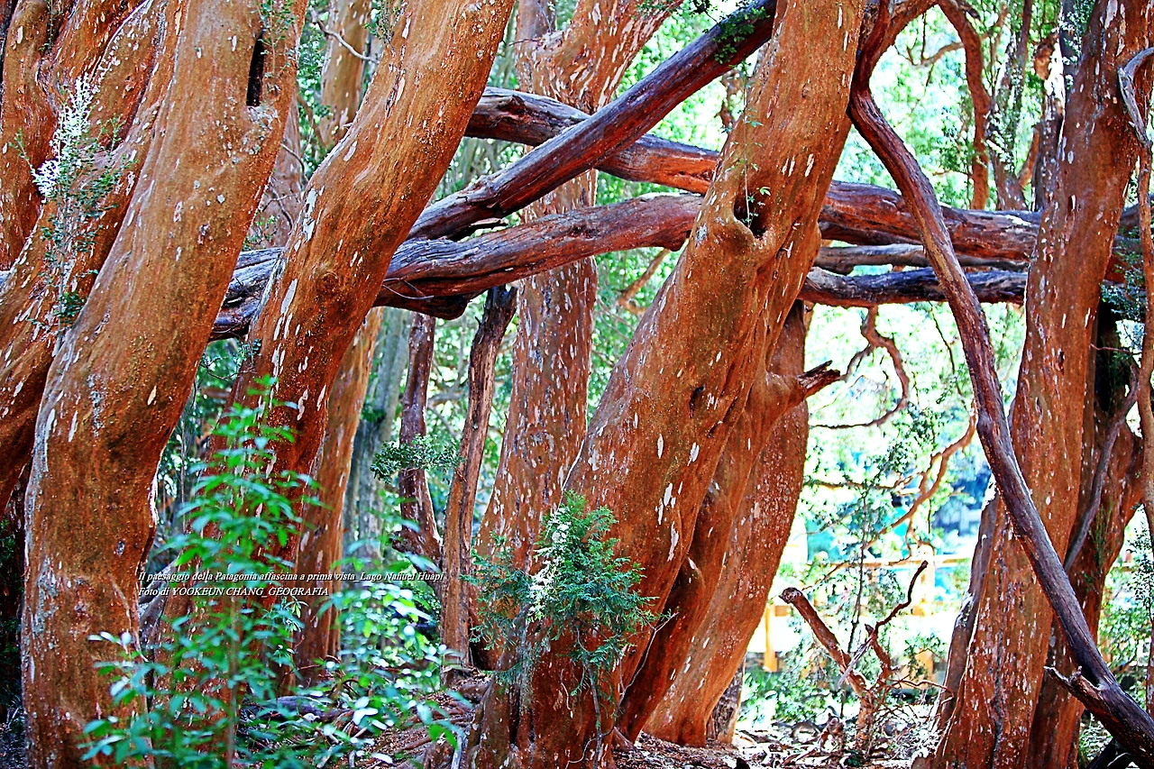 유람선 상갑판에서 바라본 숲 공원의 풍경 가운데 계피색으로 도드라져 보이는 나무들이 오늘의 주인공이다. 우리 행성의 다른 지역에서 만날 수 없는 아라야네스 군락지.. 칠레의 로스 라고스 주 북부 파타고니아에서 발견되는 군락지의 나무들은 줄기가 가는 편에 비해 이곳에는 고목과 거묵들은 물론 새로 돋아난 작은 나무들이 사람들을 맞이하고 있다. 그 현장은 이러하다.