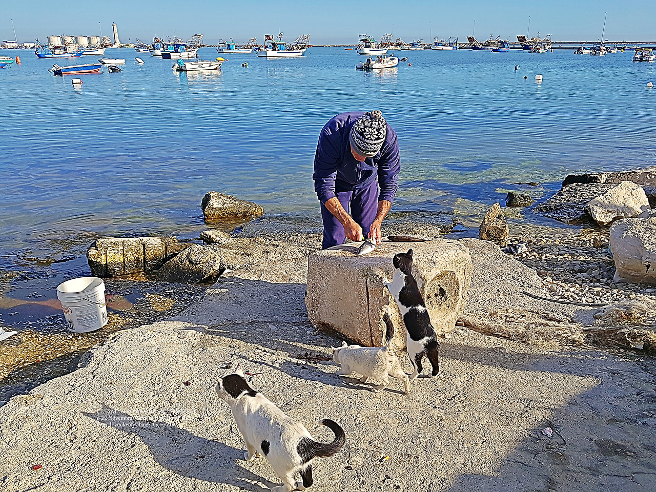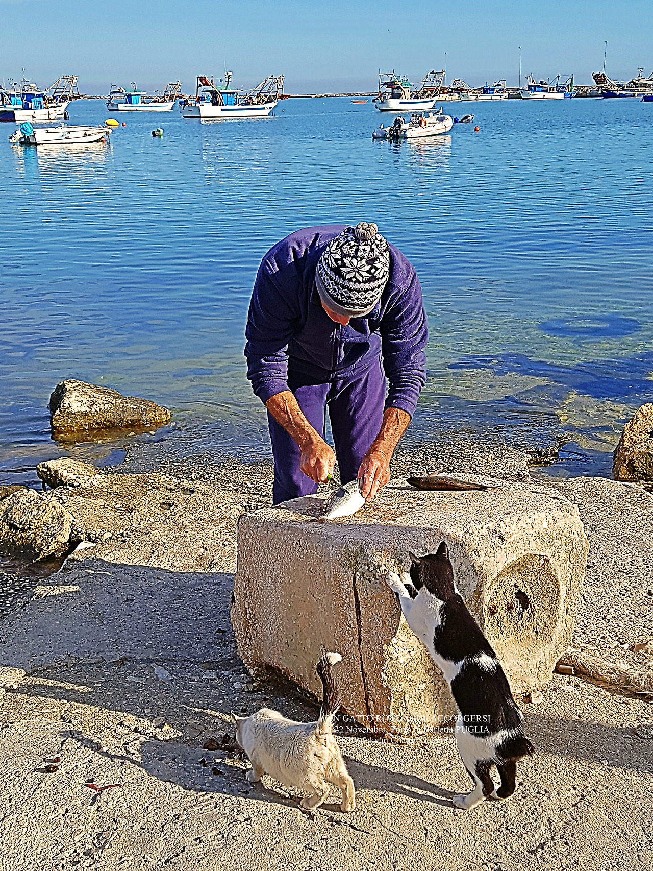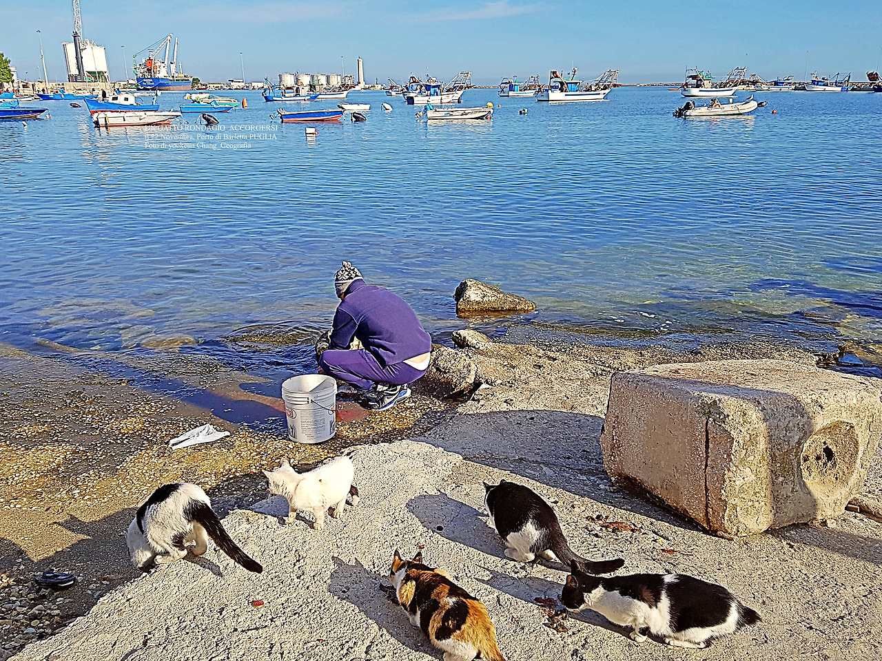 길냥이들이 쪼그려 앉아 먹이를 먹고 있는 곳은 이탈리아 남부 뿔리아 주 바를레타 항구(Il porto di Barletta) 곁이다. 그림에서 보는 것처럼 아담한 항구로 이곳에서 길냥이들이 무리를 지어 살아가고 있다. 사람들로부터 격리된 듯싶지만 녀석들이 살아가기에는 마침맞은 곳. 괜히 도시에서 얼쩡거려 봤자 음식물 쓰레기를 뒤지는 게 전부나 다름없으므로 이들에게 최적의 장소나 다름없는 곳이다.