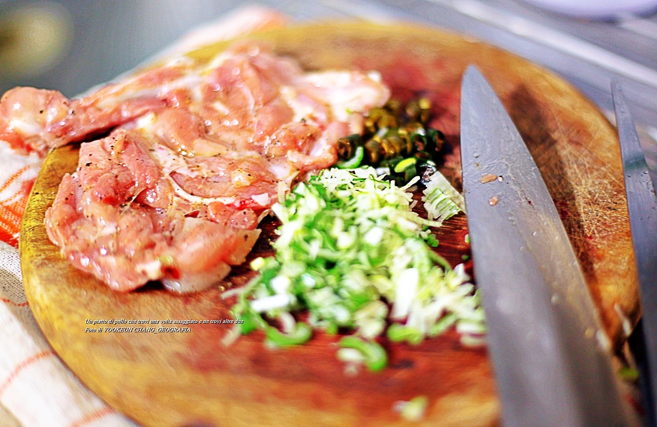 요리를 시작하기 전에 닭다리 살은 얇게 저며 펴놓고 적당히 칼집을 낸다. 그다음 소금과 후추를 흩뿌려 간을 한 다음 올리브유를 뿌려 적당히 마사지(?)한다. 이렇게 준비한 닭다리 살을 대략 30분 정도 숙성 시킨다.