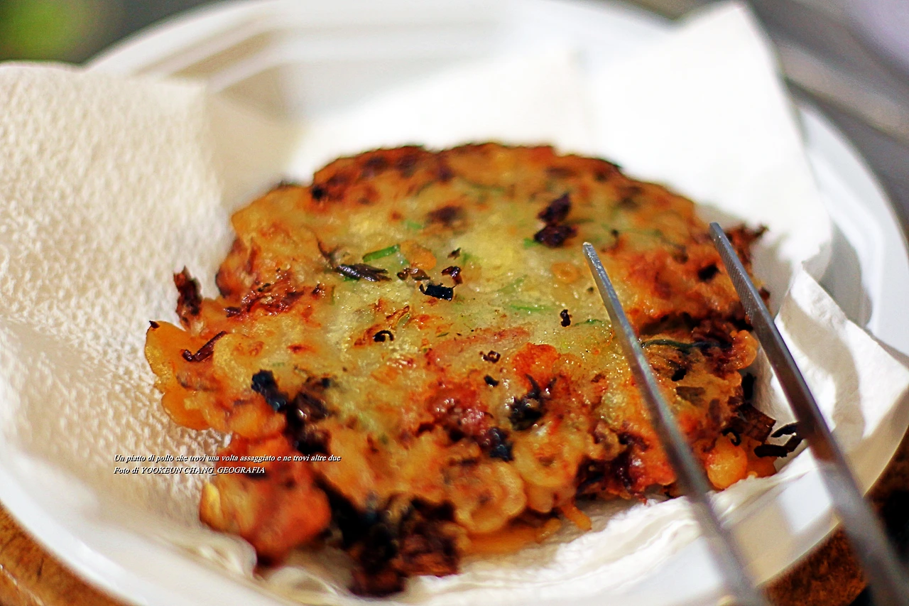 준비된 닭살을 걸쭉한 반죽 위에 놀려놓고 한쪽면에 튀김옷을 입힌다. 이때 준비된 마늘과 파와 청양고추를 골고루 올려준다. 그리고 잘 펴서 기름이 달구어진 팬 위에 조심스럽게 올려놓는다.(치익~~~) 이때 화상을 입지 않도록 조심해야 한다. 주방에서는 자나 깨나 화상을 조심해야 한다. 그래서 튀김옷을 입은 재료를 끄트머리에서부터 천천히 팬 속으로 놓게 된다.