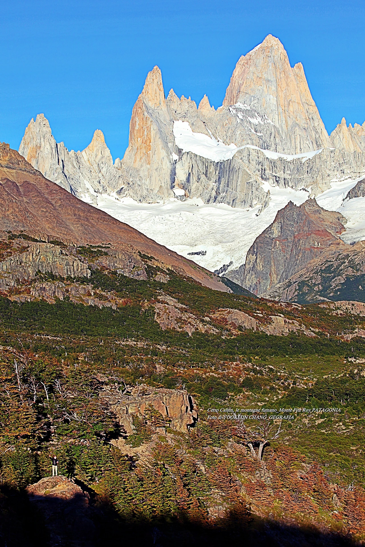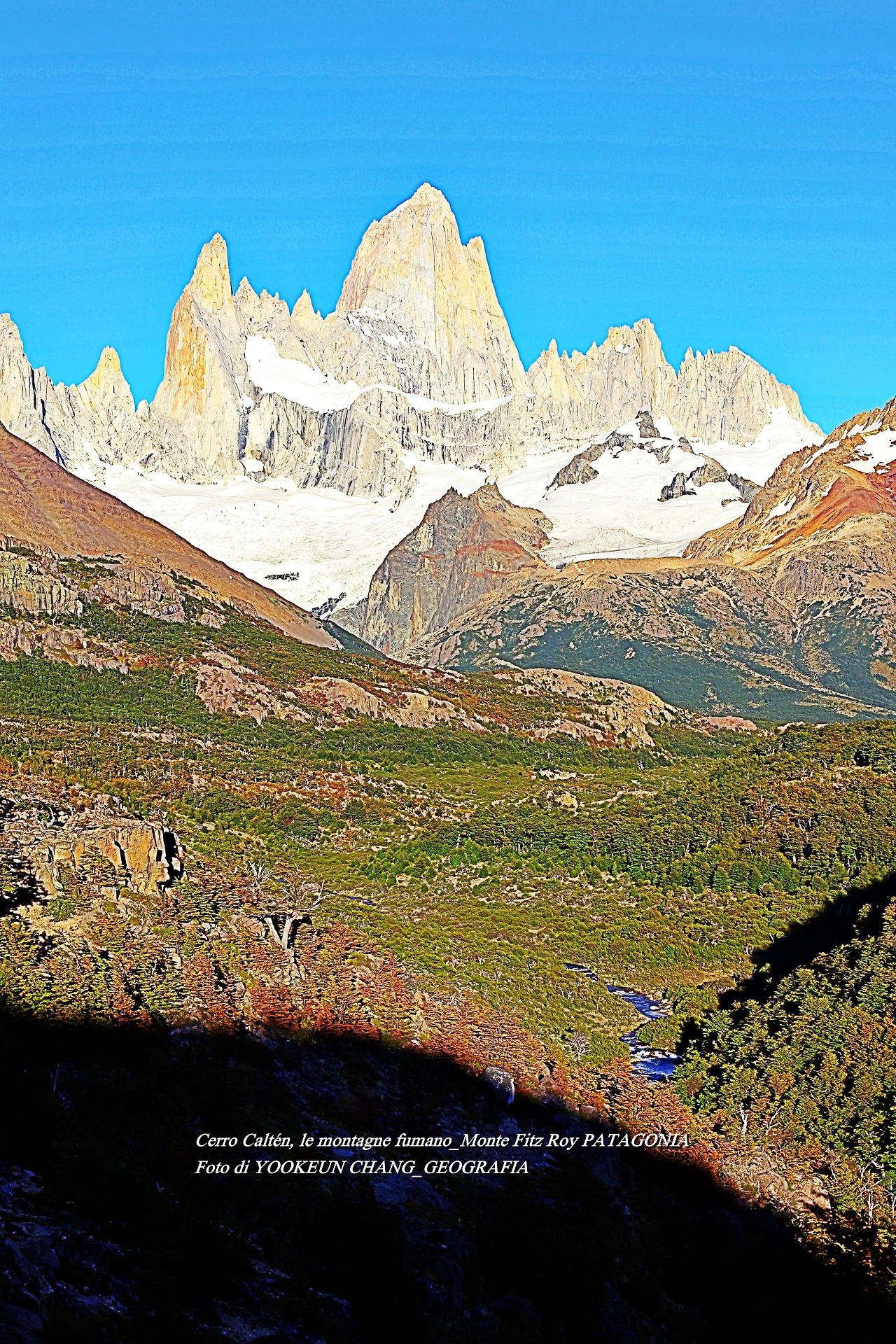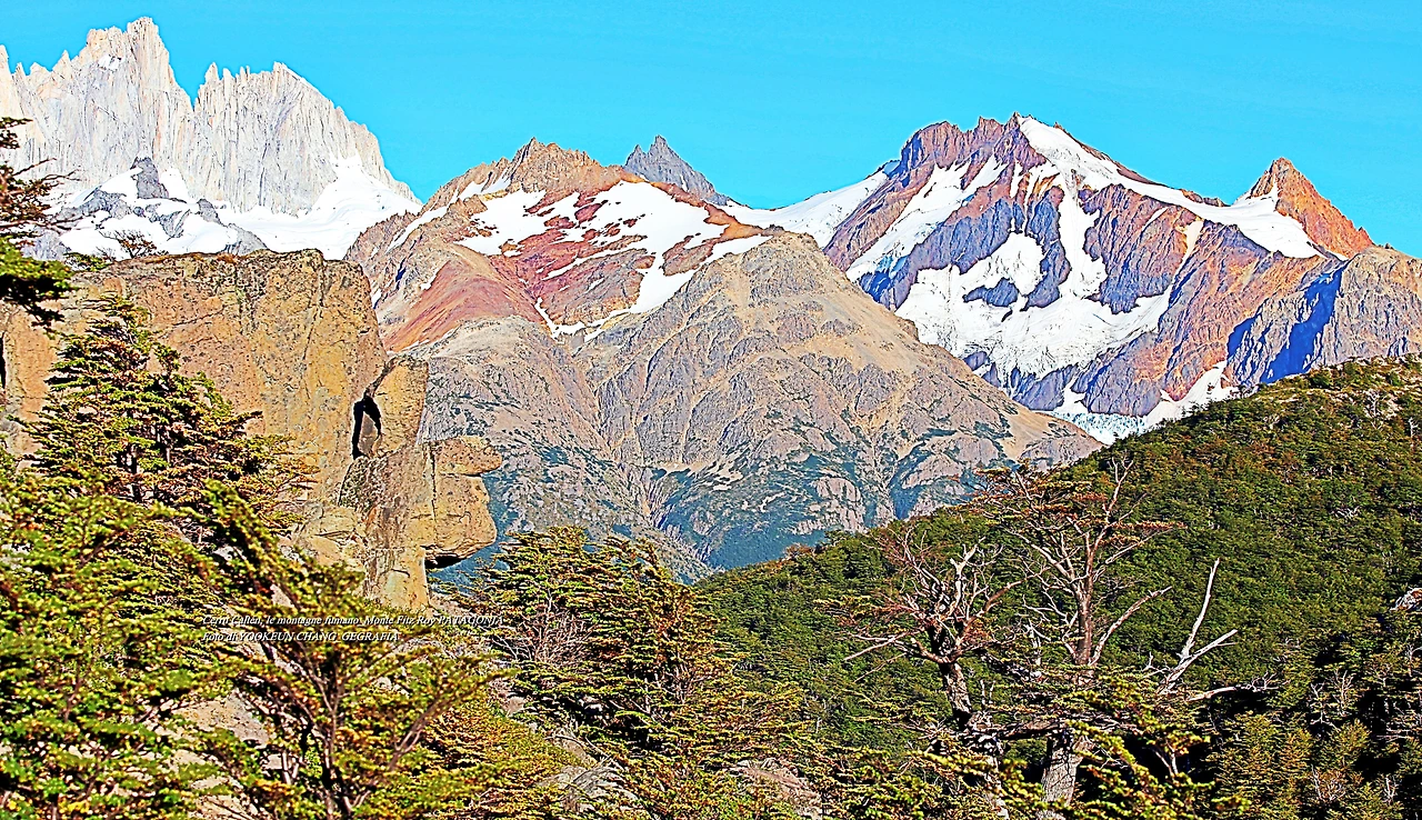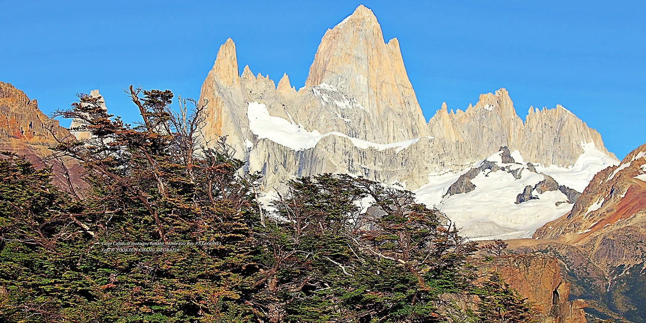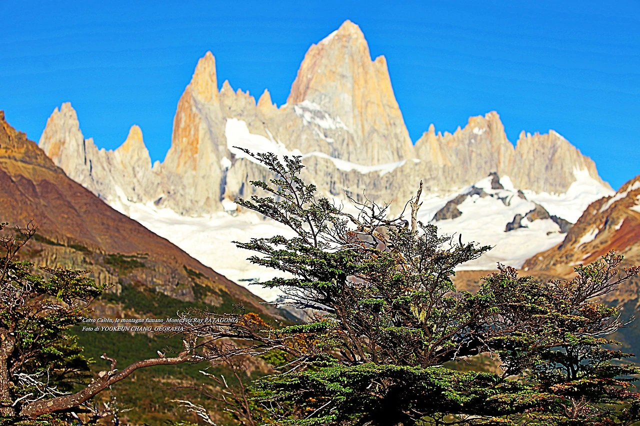 il parco nazionale Los Glaciares, nella provincia di Santa Cruz, e dalla parte cilena, forma parte del parco nazionale Bernardo O'Higgins. Raggiunge un'altezza di 3.405 metri sul livello del mare. 자료출처: https://it.wikipedia.org/wiki/Monte_Fitz_Roy