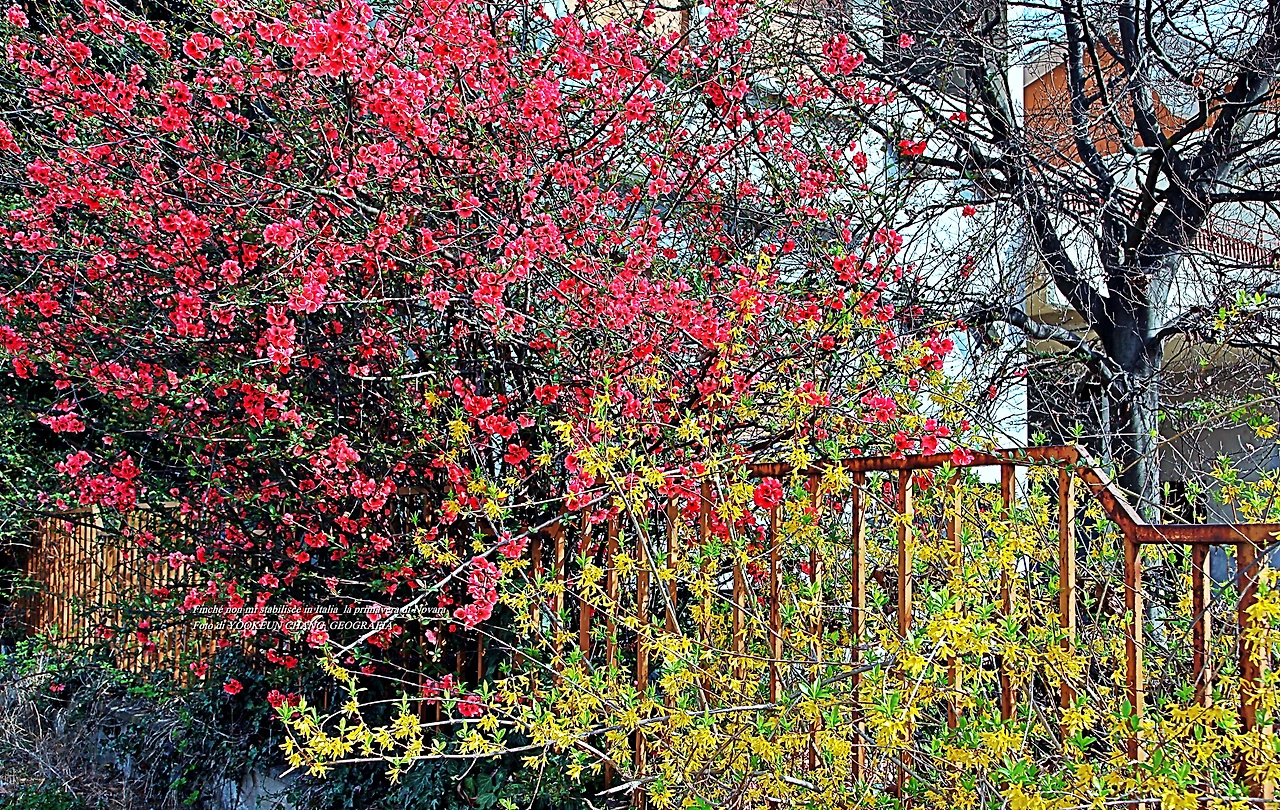 수로 곁에는 온통 꽃의 요정들로 물들었다. 명자꽃이 울타리 곁에 흐드러지게 피어 개나리꽃과 함께 떼창을 부르고 있는 풍경.. 이런 풍경을 접시 위에 올리면 식도락가들의 입맛을 마구 부채질한다. 특정 리체타 위에 명자꽃의 느낌을 올려놓으면 음식이라기보다 하나의 작품으로 재탄생하는 것.