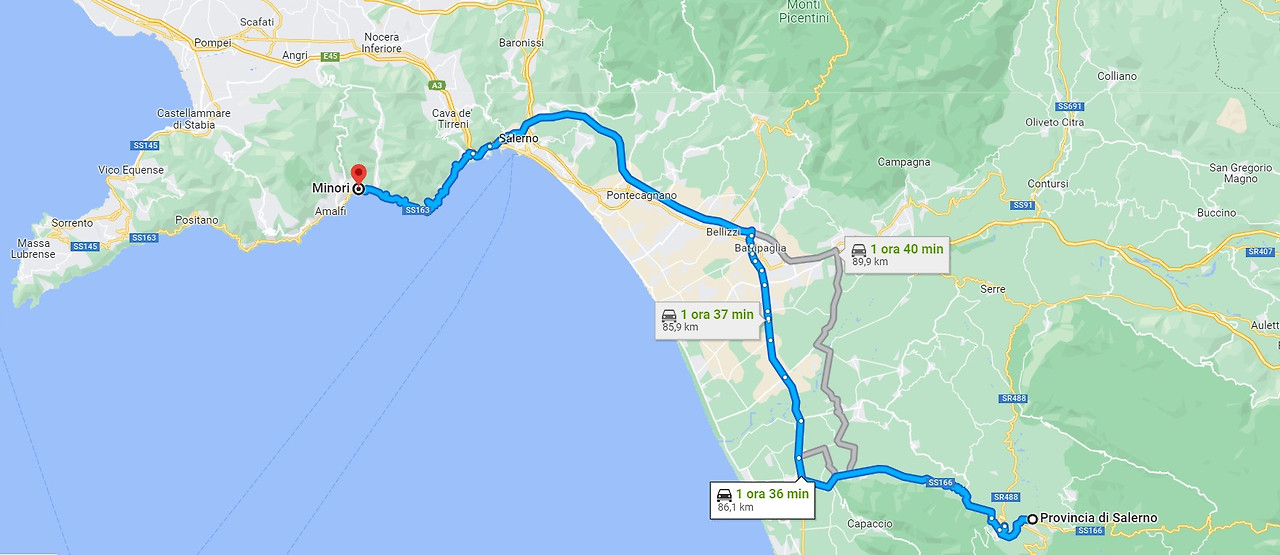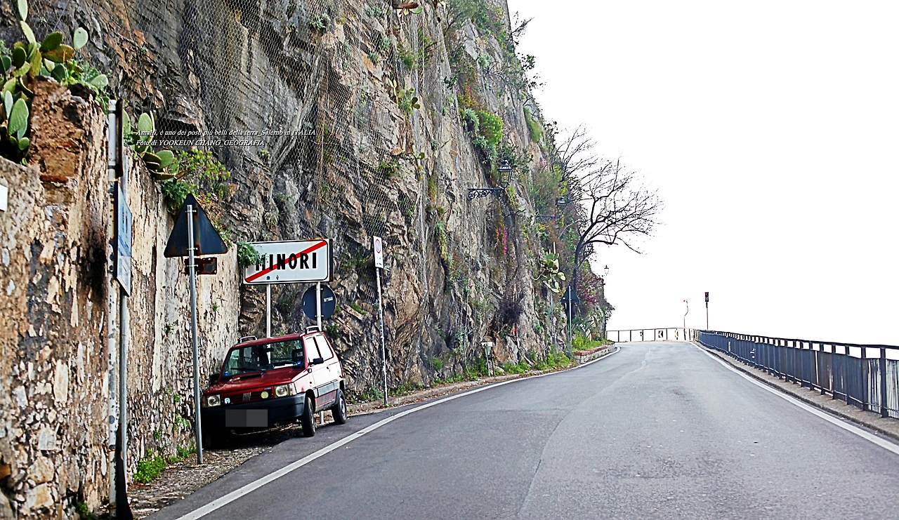 아말피를 등지고 바를레타의 집으로 돌아가는 길에 미노리(MINORI)가 끝나는 지점의 경계선이 보인다. 현재 위치를 구글지도에서 캡쳐해 봤다. 지도를 봤을 때 아말피는 미노리 좌측에 위치해 있다.