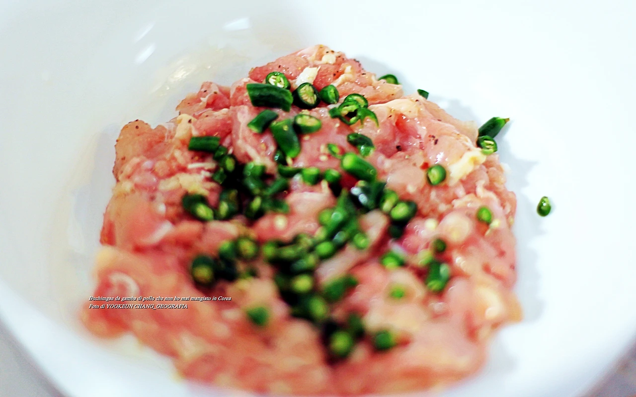 큼직한 백 자기 볼에 다진 살을 넣고 미리 준비한 청양고추를 흩뿌린다. 닭다리살 하나에 청양고추 9개.. 그렇지만 식 미 껏 조절할 수도 있다. 이 요리의 팁은 청양고추가 맛을 좌지우지할 정도이다. 닭살 특유의 맛을 잡아줄 뿐만 아니라 요리가 끝났을 때 식감과 풍미를 좌우한다.