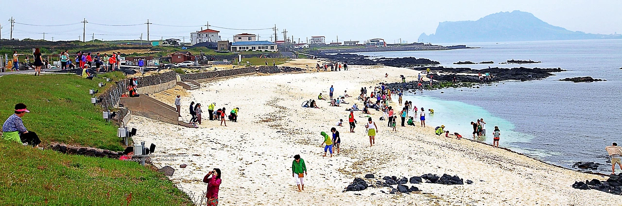 서빈백사를 한 번 더 소개해 드린다. 우도 '서빈백사(홍조단괴해빈(紅藻團塊海濱)으로 불린다고 말했다. 홍조단괴는 김. 우뭇가사리 같은 홍조류가 해안 퇴적 과정 중 백사장을 만드는 것을 말한다. 제주도의 다른 해빈 퇴적물과는 달리 우도 해빈퇴적물의 구성입자 중 96.3%가 홍조단괴로 알려졌다. 멀리 가락국수 하우목동항 방파제가 한눈에 들어온다.