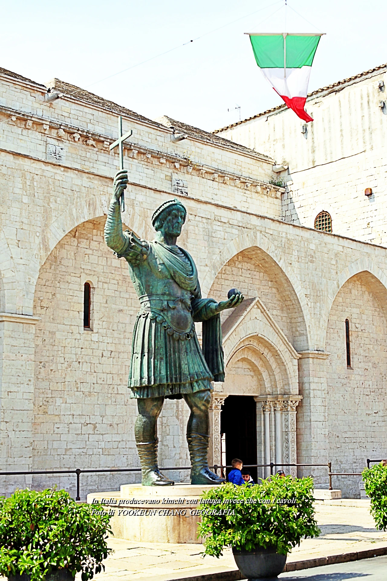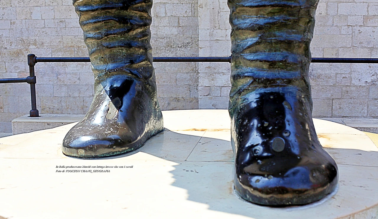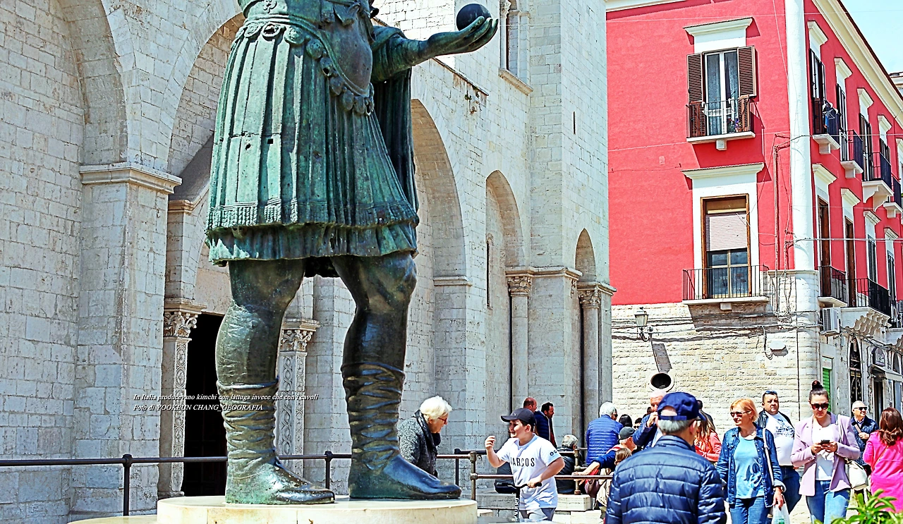 장화의 발등이 뺀질 뺀질.. 누군가 일부러 광을 내놓은 듯한 반질반질 닦은 신발의 의미를 일면 그 이유를 알게 된다. 이곳은 바를레타 중심이자 상징인 에라끌리오(Eraclio - Il Colosso di Barletta)가 위치한 곳이다. 5세기 경에 만들어진 4.5m 높이의 거상은 청동으로 만들어졌다. 신에 대한 인간의 열망을 표현한 비잔틴 예술의 하나로 재밌는 전설이 발등에서 발현된다.