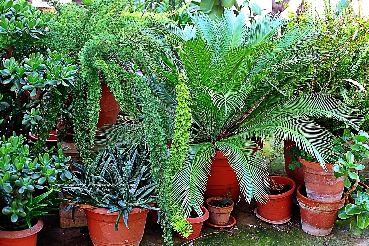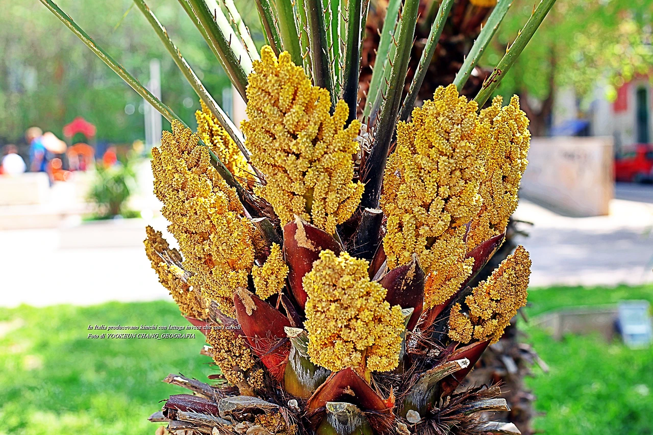 집에서 지근거리에 있는 공원에 꽃을 내놓은 대추야자가 싱그럽다.
