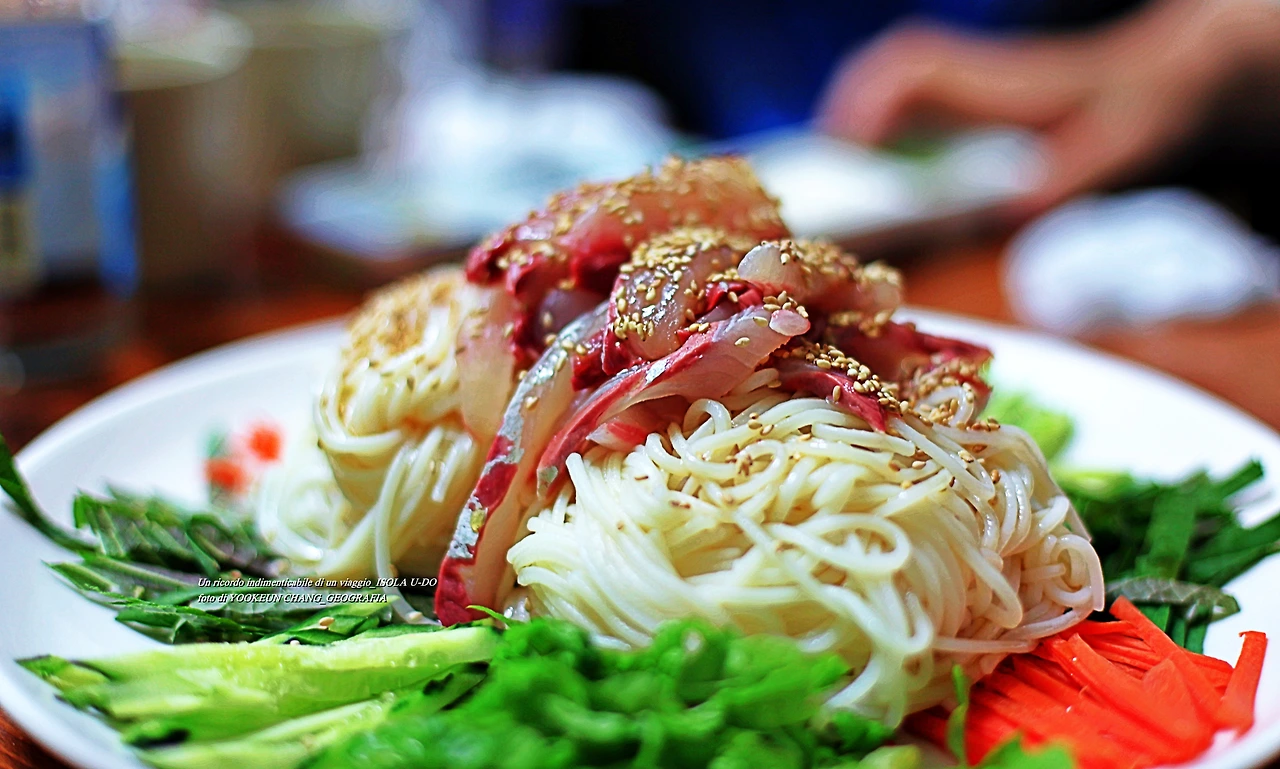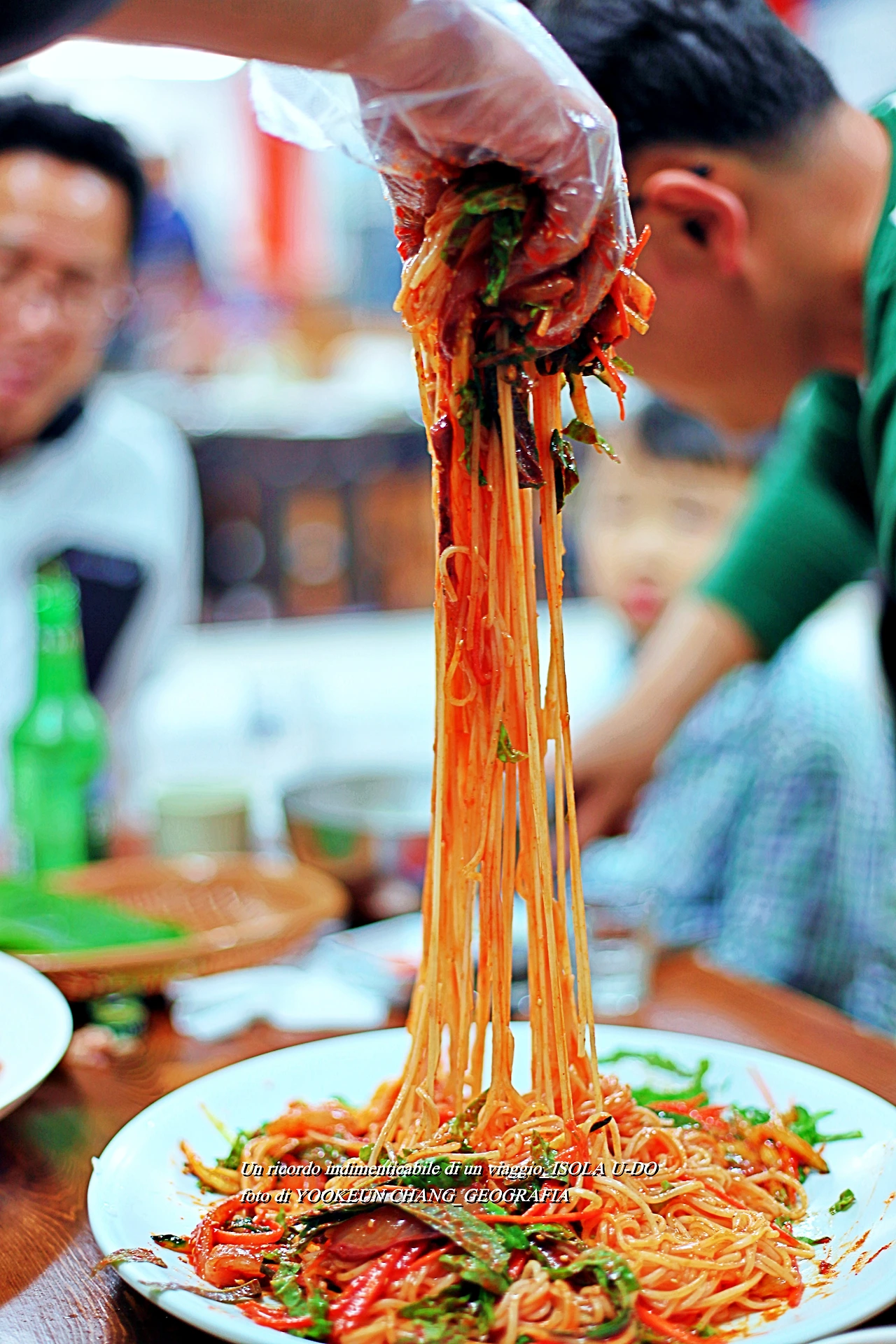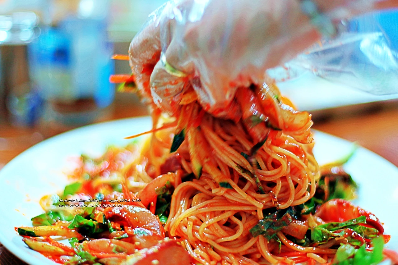 위 자료사진처럼 도톰하게 썰어진 회와 국수 위에 초고추장을 뿌리고 손으로 주물럭거려 비벼대니 침이 절로 넘어가는 것. 회와 국수의 절묘한 만남도 세 번 망한 후에 손님들의 식습관을 잘 관찰한 끝에 만들어진 노하우.. 만약 그가 세 번 망한 뼈아픈 경험이 없었더라면 오늘날 우도에서 회국수를 맛볼 수 없었을지도 모른다. 그가 세 번 망한 후 터득한 노후우는 처음과 너무도 달라져있었다.